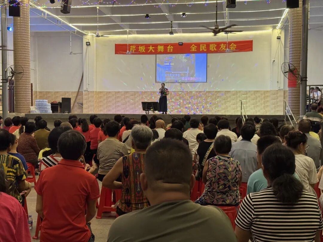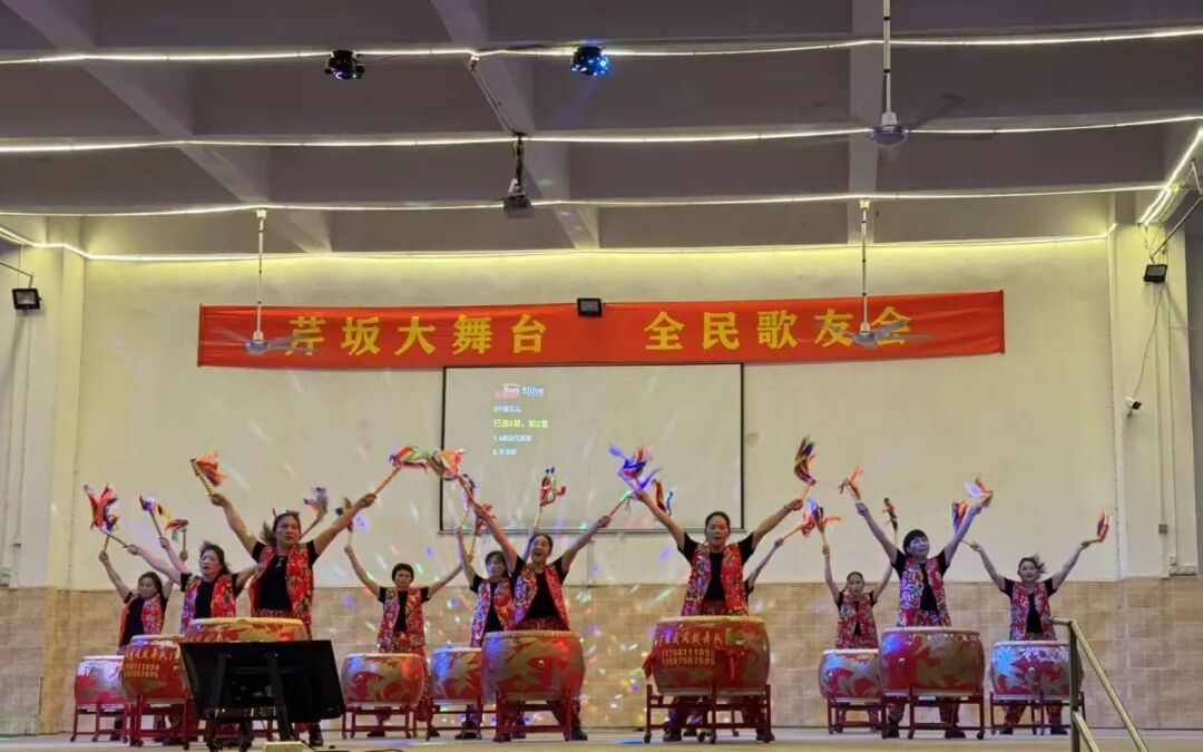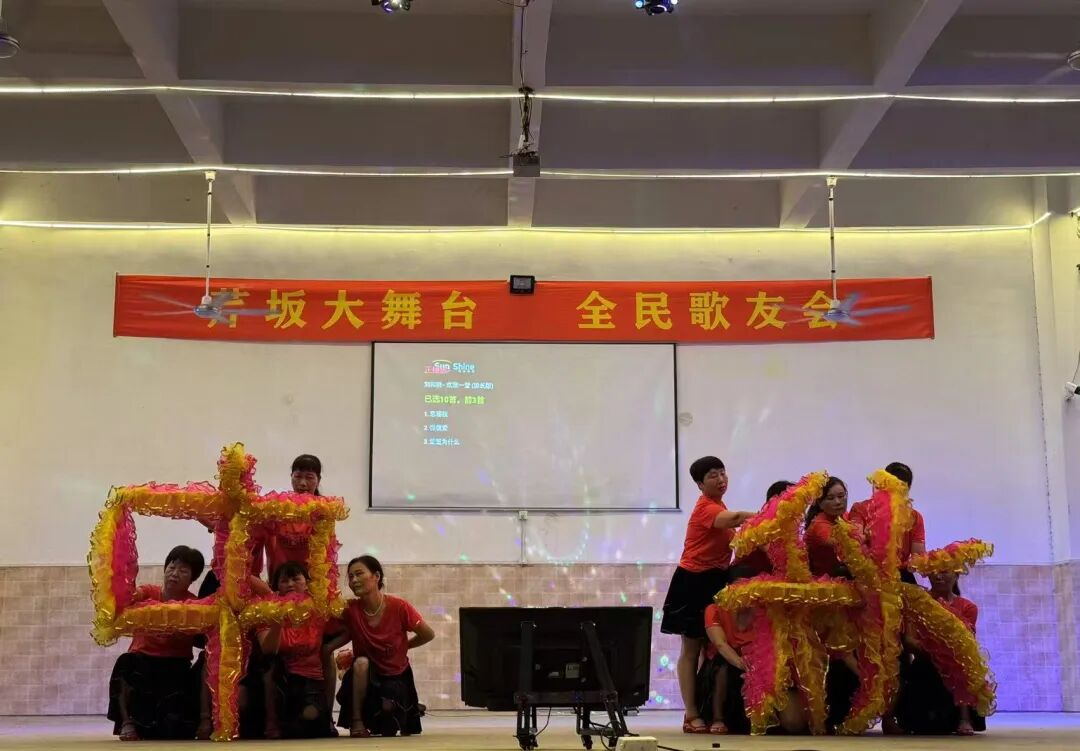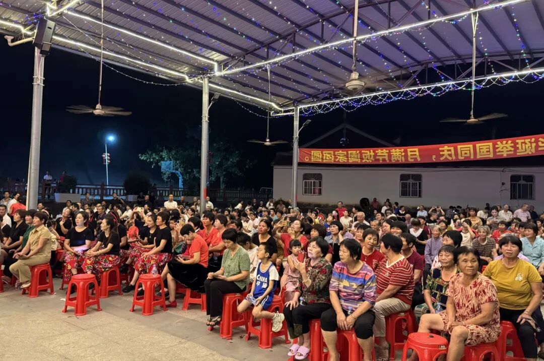 鼓点渐歇,旋律转柔。由芹坂村扇子舞蹈队带来的《欢聚一堂》接档登场,队员们手持红黄相间的彩扇,随音乐变换队形,扇面开合间勾勒出“中秋”的美好图景。紧接着戏曲表演、K歌环节轮番上场,更有朗诗德企业《抓钱舞》来助阵,将双节团圆的祥和氛围推向高潮,不少村民拿出手机记录下这热闹瞬间。