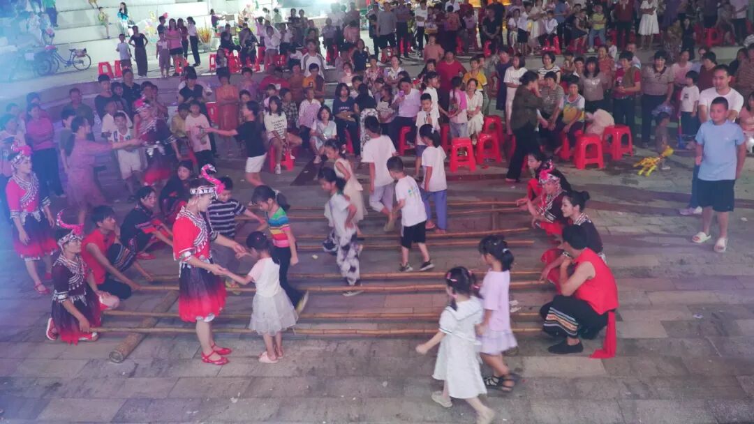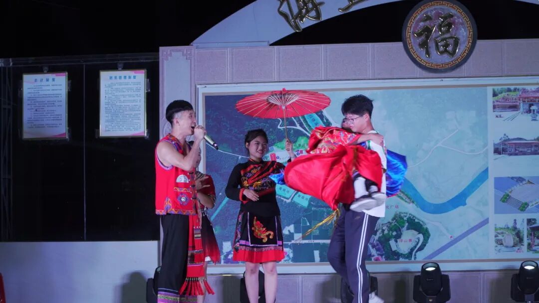 畲族文化互动环节成为晚会高潮。原汁原味的畲族婚嫁表演,不仅展示了畲族独特的民俗风情,更邀请现场观众上台扮演“新郎”“赤郎”等角色,让观众沉浸式体验畲族婚礼的趣味与热闹。竹竿舞则吸引大人小孩踊跃参与,清脆的敲击声与欢笑声交织,现场氛围热烈。