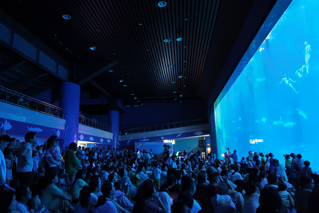 游人驻足欣赏天柱山欢乐大世界海底巨幕表演