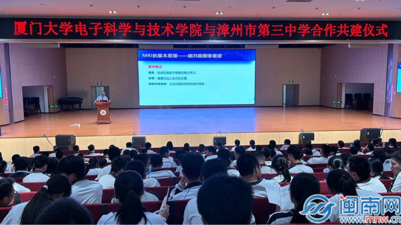 闽南网10月24日讯(通讯员 郑如桥 闽南网记者 柯嘉进 文/图)为拓宽三中学子科学视野,激发其对前沿科技的探索热情,10月22日下午,漳州市第三中学博学讲坛开展“走近大师”系列活动第五场,特邀厦门大学电子科学与技术学院沈桂平教授,为三中学子带来关于核磁共振的专题科普讲座。本次讲座以严谨的科学体系为支撑,搭配生动形象的讲解方式,让同学们沉浸式领略了前沿科技的魅力。