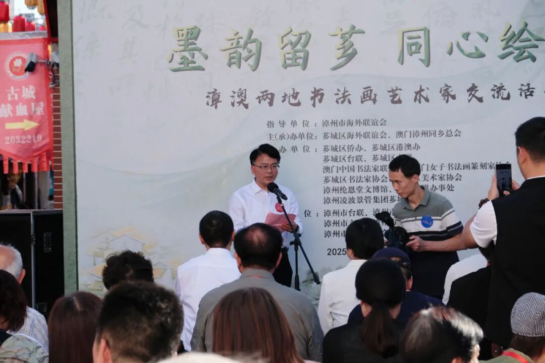 为庆祝中华人民共和国成立76周年、澳门回归26周年,全面贯彻落实党的二十大和二十届四中全会精神,深入学习贯彻习近平总书记在福建考察时的重要讲话精神,发挥在澳同乡社团桥梁纽带作用,11月15日,“墨韵留芗·同心绘梦”漳澳两地书法画艺术家交流活动在芗城举办,数十名漳澳两地书法画艺术家欢聚千年漳州古城开展艺术交流。漳州市委统战部部务会成员、市职教社专职副主任张磊,漳州市台联副会长卢芸艺,漳州市文联副主席张清浪,芗城区委常委、统战部部长魏毅坤参加活动。