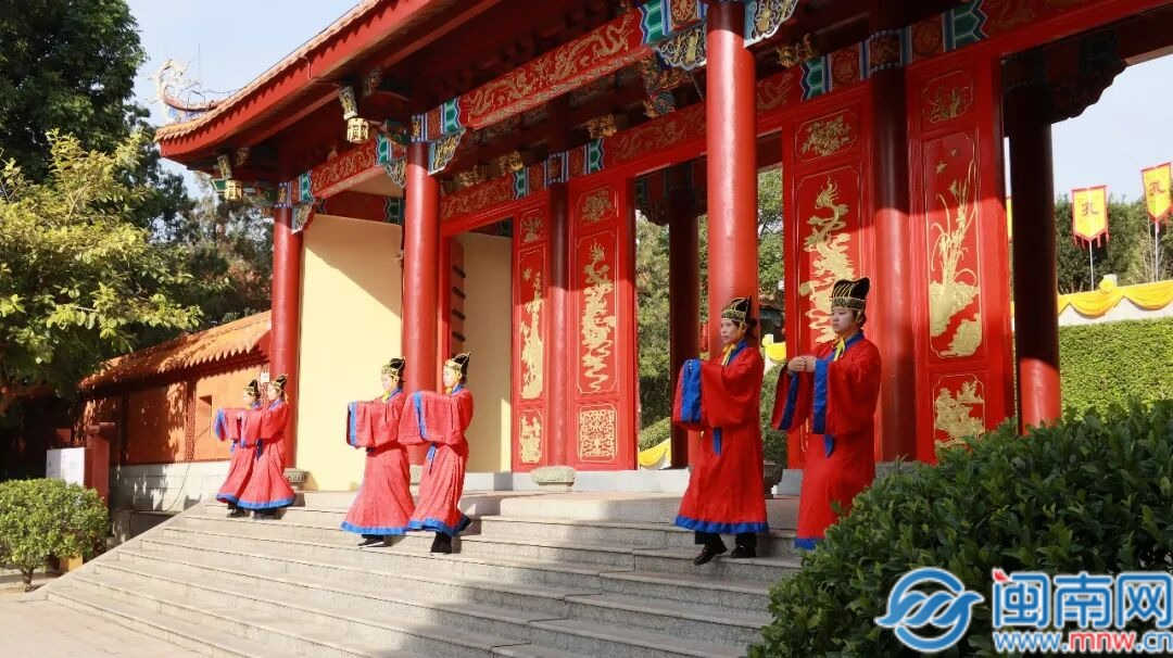 上午,长泰文庙内钟鼓齐鸣、礼乐悠扬。全体人员统一佩戴黄色绶带,在礼生引导下,迈着沉稳的步伐向孔子行教像行进。