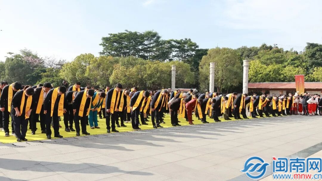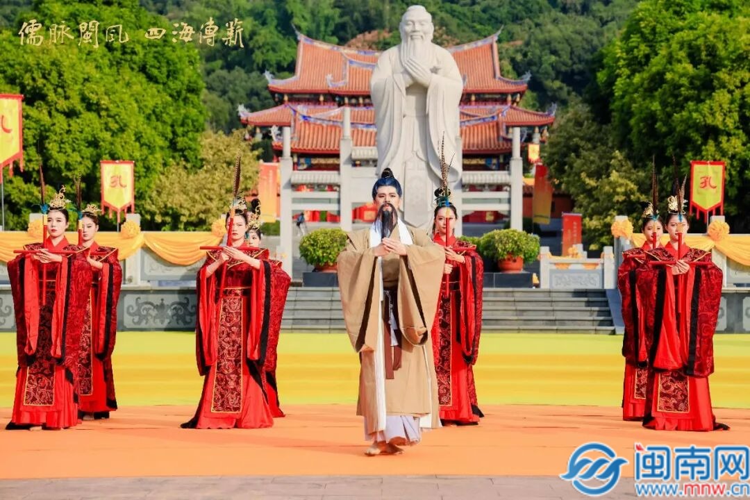 行至孔子行教像前,300名学子齐声诵读经典名句。子曰:“学而时习之,不亦说乎,有朋自远方来,不亦乐乎?人不知而不愠,不亦君子乎?”……随着《论语》诵读声停止,系列舞蹈展演串联文脉传承,《迎宾舞》以礼敬先师,男声画外音颂 “至圣先师,万世师表”;情景舞蹈再现朱熹治学、林震传脉的儒风南迁;闽南特色舞蹈伴童声诵读《劝学》与《论语》经典;终章以迎宾之礼、闽南之韵敬邀四海宾朋共沐儒风。