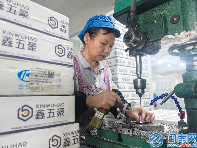 漳州鑫五豪科技有限公司的生产车间,工人们正在进行产品钻孔工作。郑晓梅摄