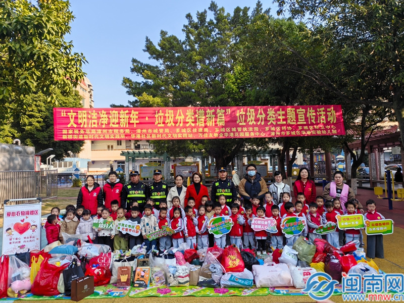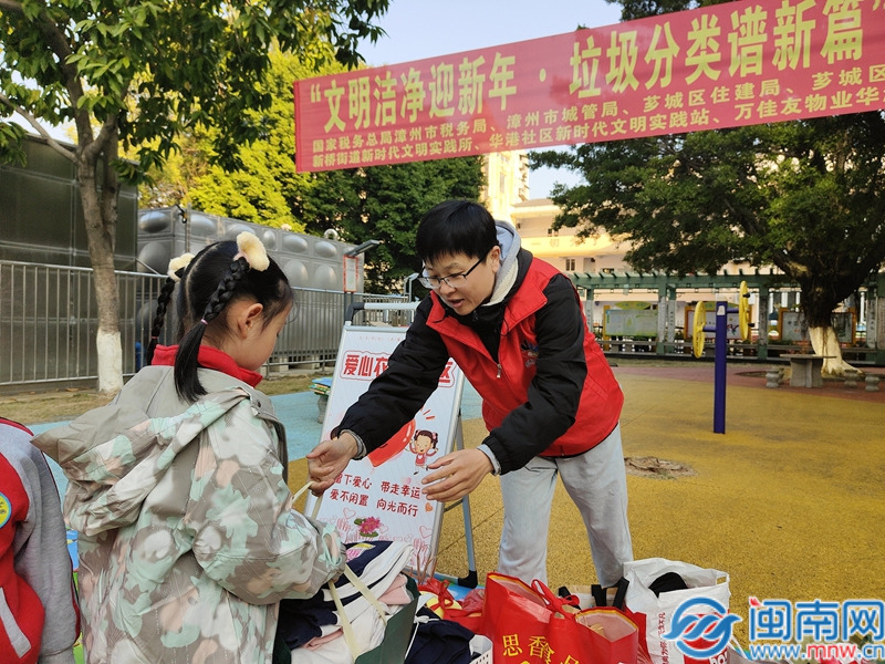 闽南网1月15日讯(通讯员 蔡霖霖 闽南网记者 张恩培)1月13日,“文明洁净迎新年 垃圾分类谱新篇”主题宣传活动在芗城区新桥街道华港花园小区开展。活动紧扣垃圾分类工作要求和“节前清屯”倡议,以公益捐赠搭配互动宣讲的形式,让绿色环保理念深深扎根童心。
