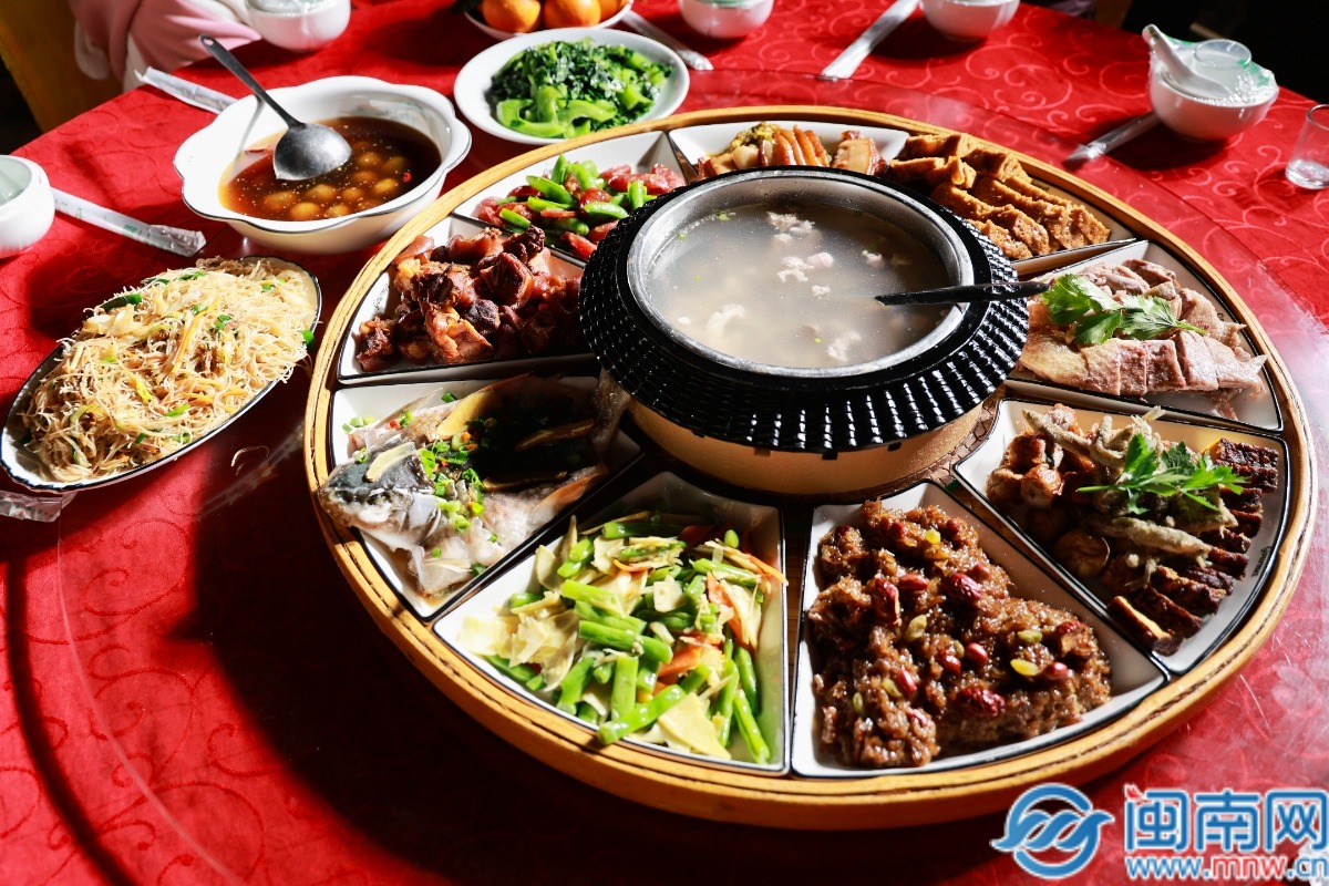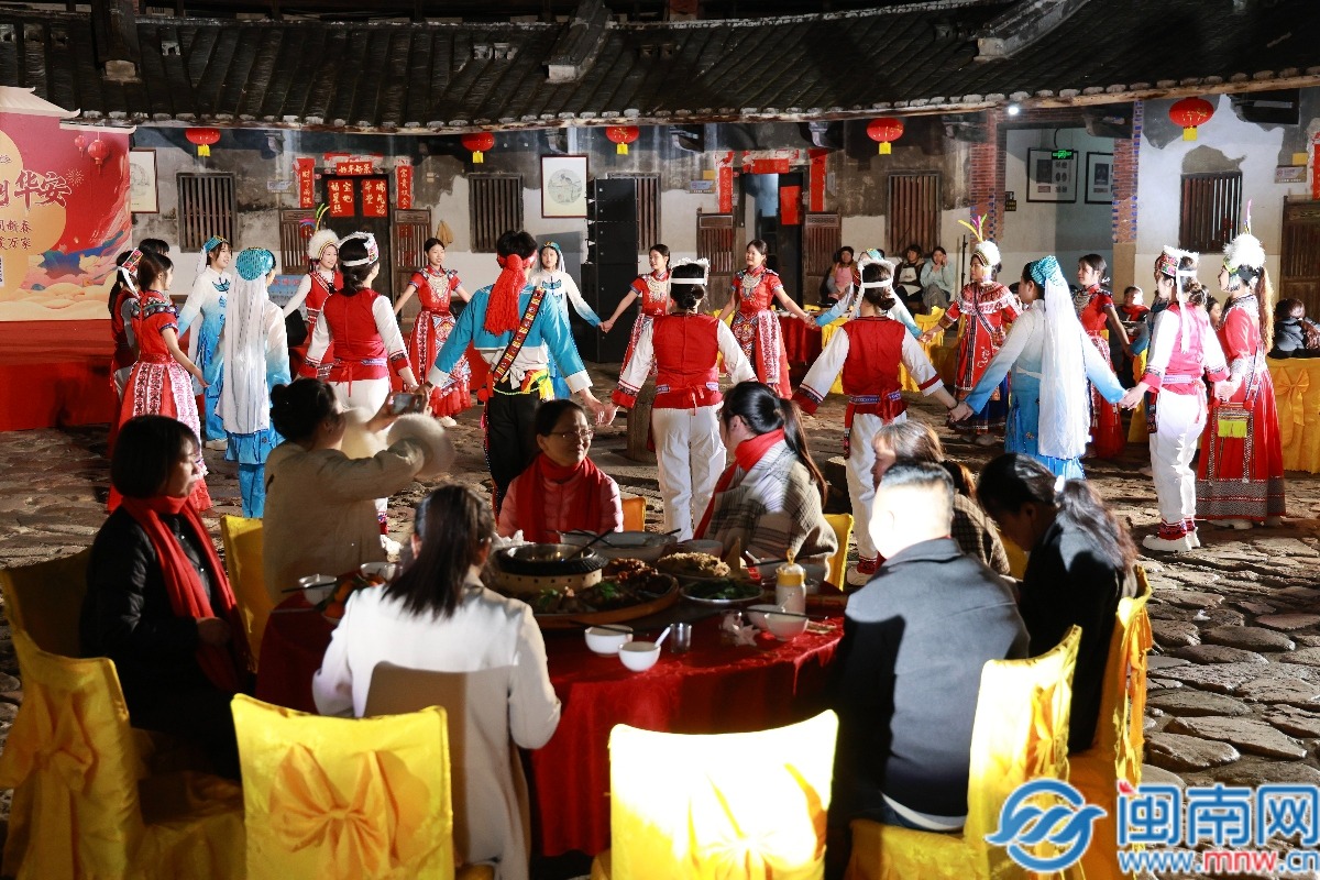 伴着表演,新春家宴也必不可少。一桌桌闽南特色宴席摆开:炒米粉寓意前程似锦,八宝饭象征生活甜美,软糯“水龙圆”更是地道风味……各色菜肴满足了游客们的味蕾。“高山流水”敬酒仪式将气氛推向高潮——竹筒相连,家酿米酒潺潺流下,接过这碗酒便接住了连绵福气。