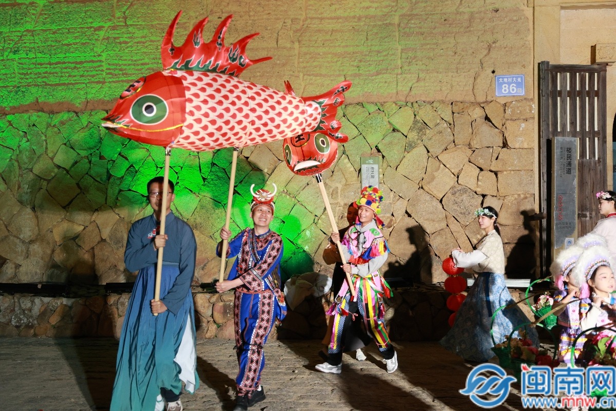 暮色中,身着民族服饰的少女挑着花篮,寓意花开富贵。福灯巡游队伍向游客缓缓走来,土楼姑娘将福球和糖果抛向人群,游客们争相接住,年味扑面而来。