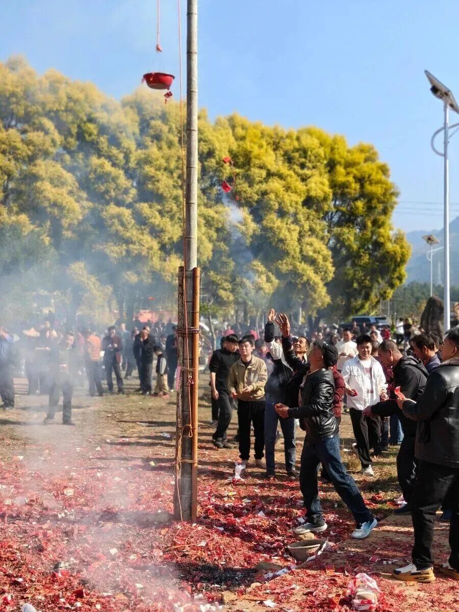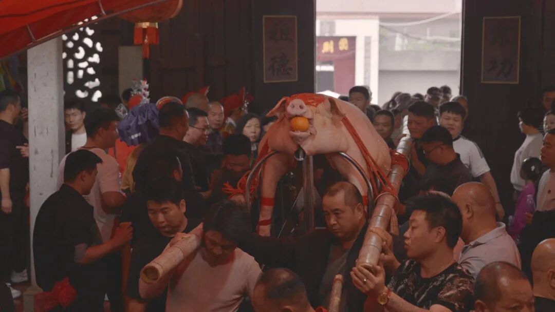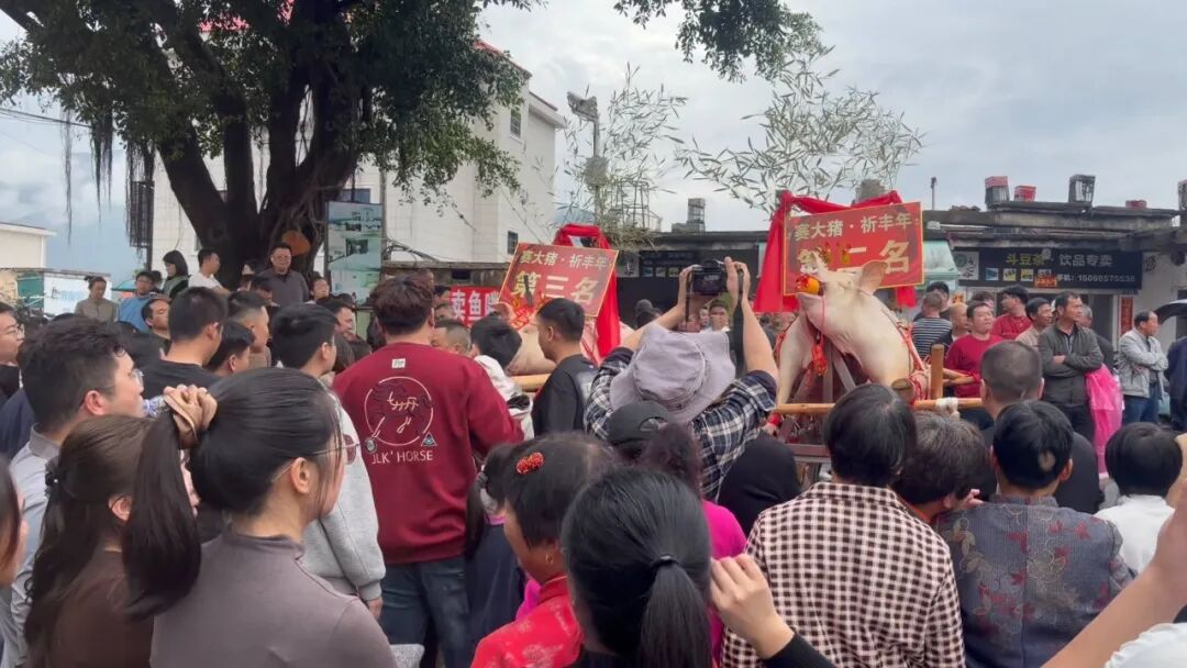 在山重村,“赛大猪·祈丰年”活动准时开始。下午,村广场上聚满了人。各家各户把精心挑选的大猪抬出来,披红彩、衔福桔、贴红纸,一头挨一头并排摆在特制的木架上。围观的人群里三层外三层,手机、相机举得老高。
