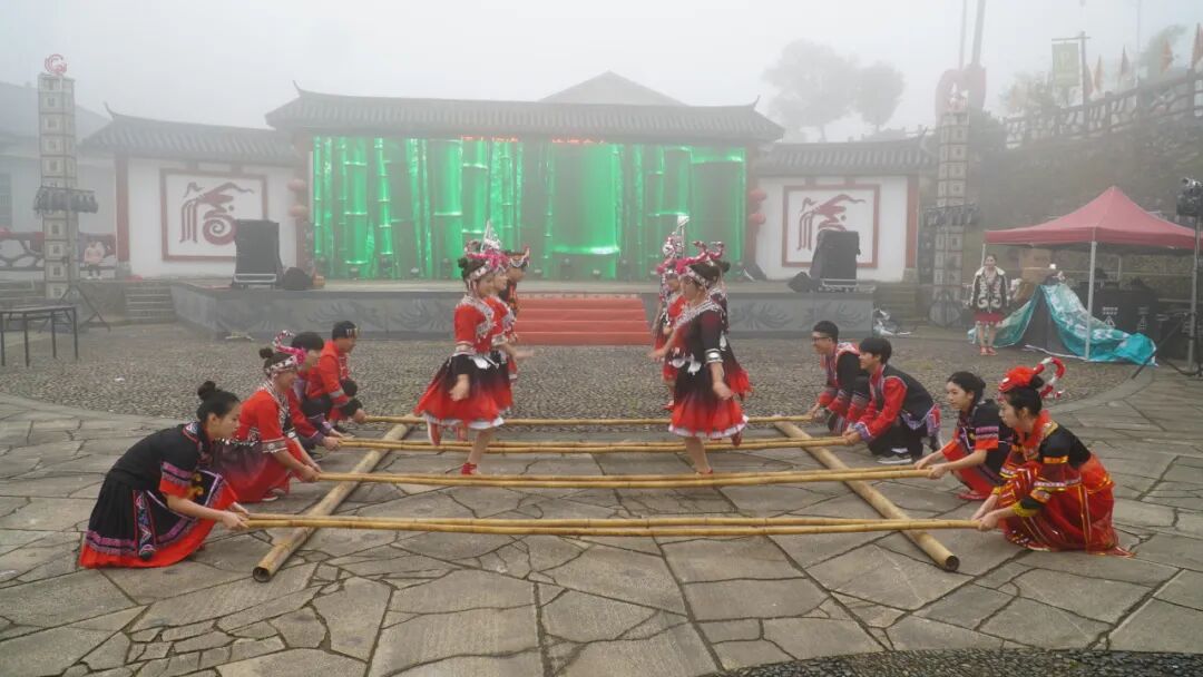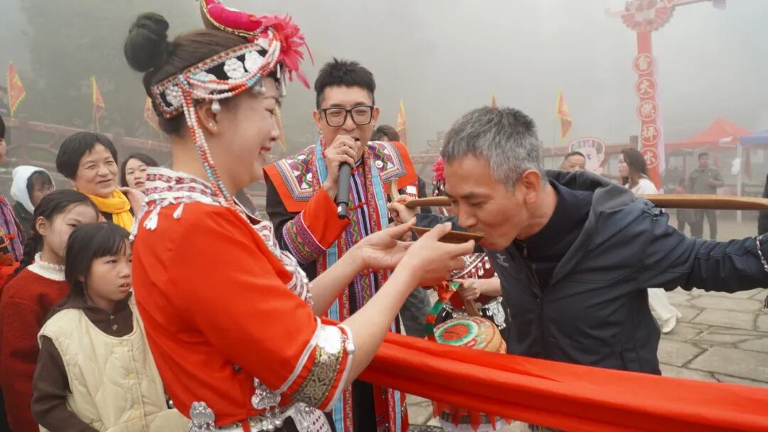 随着一声嘹亮的山歌响起,身着传统凤凰装的畲家姑娘们成为全场焦点,她们在“竹竿舞”“抛绣球”“高山流水”等充满趣味的婚俗环节中,向游客们生动再现了畲族古老而独特的婚嫁文化。