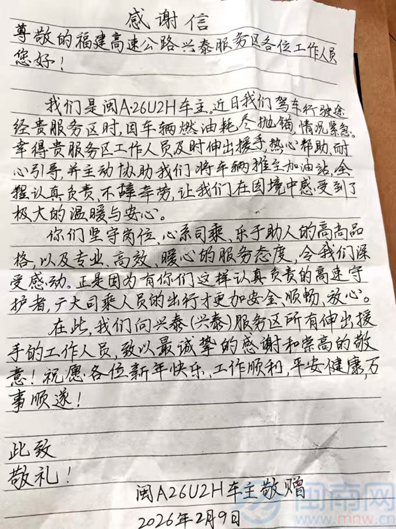 闽南网2月27日讯(通讯员 黄少聪 闽南网记者 柯嘉进 文/图)春运旅途,车水马龙,暖心故事时刻上演。近日,兴泰服务区接连收到旅客送来的感谢信与锦旗,两份真挚致谢背后,是服务区工作人员跨区域为湖北游客寻回失物、化身“推车侠”救助受困车辆的暖心举动。大家以真诚守护旅途平安,用担当践行服务初心,让服务与感恩在春运归途上构筑起温暖动人的双向闭环。