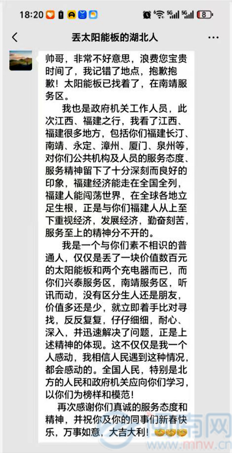 无独有偶,暖心一幕再次上演。2月18日,兴泰服务区接到一通来自湖北自驾游游客的求助电话,该顾客表示,除夕当天下午途经服务区时,不慎遗落了一块价值数百元的太阳能板和两个充电器。因时隔两日且记忆模糊,无法准确说明遗失位置。首轮搜寻无果后,工作人员并未放弃,而是顺着游客提供的零星线索持续追踪,最终在南靖土楼服务区找到遗失物品,实现完璧归赵。这份跨越区域的用心相助,让游客深受感动,特意发来感谢短信:“兴泰服务区、南靖土楼服务区,听讯而动,没有区分生人还是朋友、价值多还是少,立即着手比对寻找……”质朴的文字,饱含着对服务区工作人员最真切的认可。