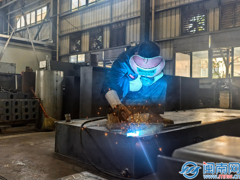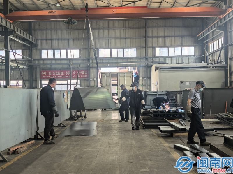 福建奥斯福电力系统有限公司生产车间内,工作人员正在进行焊接工作。郑晓梅摄