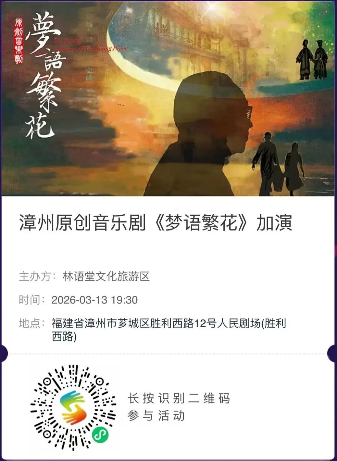 《梦语繁花》不仅是一部音乐剧,更是漳州文化的一次生动表达 。它让我们重新认识林语堂这位从漳州走向世界的文学巨匠 ,也让我们看到本土原创艺术的无限可能。3月13日,让我们一起走进剧场,在音乐和故事中,感受大师的精神世界。