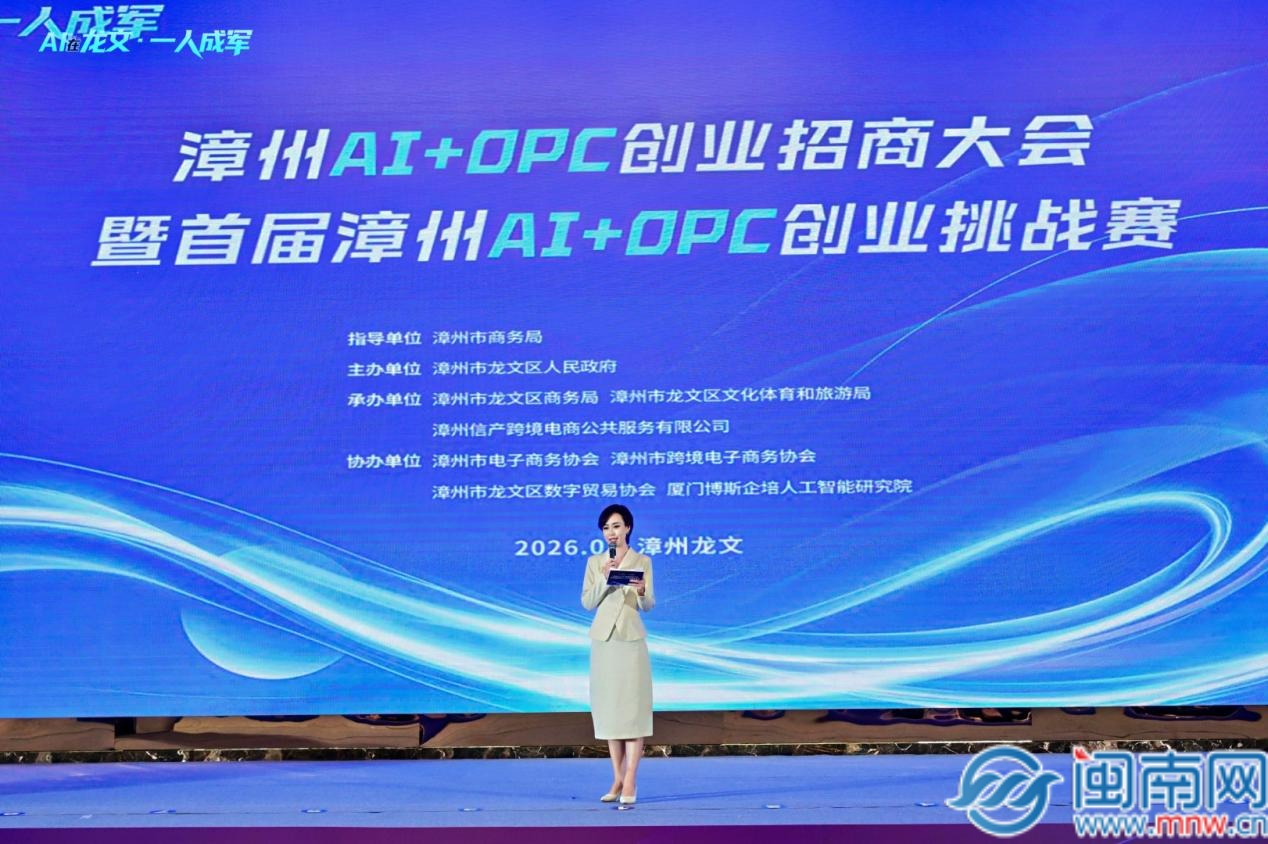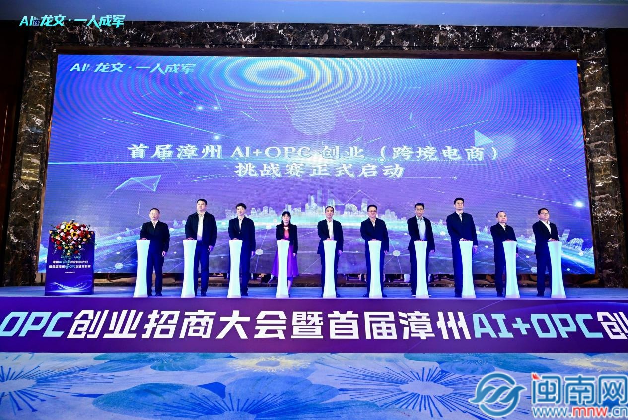 闽南网3月12日讯(闽南网记者 张恩培 )2026年3月12日,由漳州市商务局指导,漳州市龙文区人民政府主办,漳州市龙文区商务局、漳州市龙文区文化体育和旅游局、漳州信产跨境电商公共服务有限公司承办的漳州AI+OPC创业招商大会暨首届漳州AI+OPC创业挑战赛启动仪式在漳州万达嘉华酒店隆重举行。活动以“AI在龙文·一人成军”为核心主题,旨在推动AI技术与OPC(一人公司)创业模式的深度融合,着力打造全省首个AI+OPC促进发展中心,并树立全国首个“AI+OPC+跨境电商”垂直赋能标杆,打造福建省OPC产业发展核心枢纽。省、市、区各级领导、企业家及创业者代表等近250人齐聚一堂。