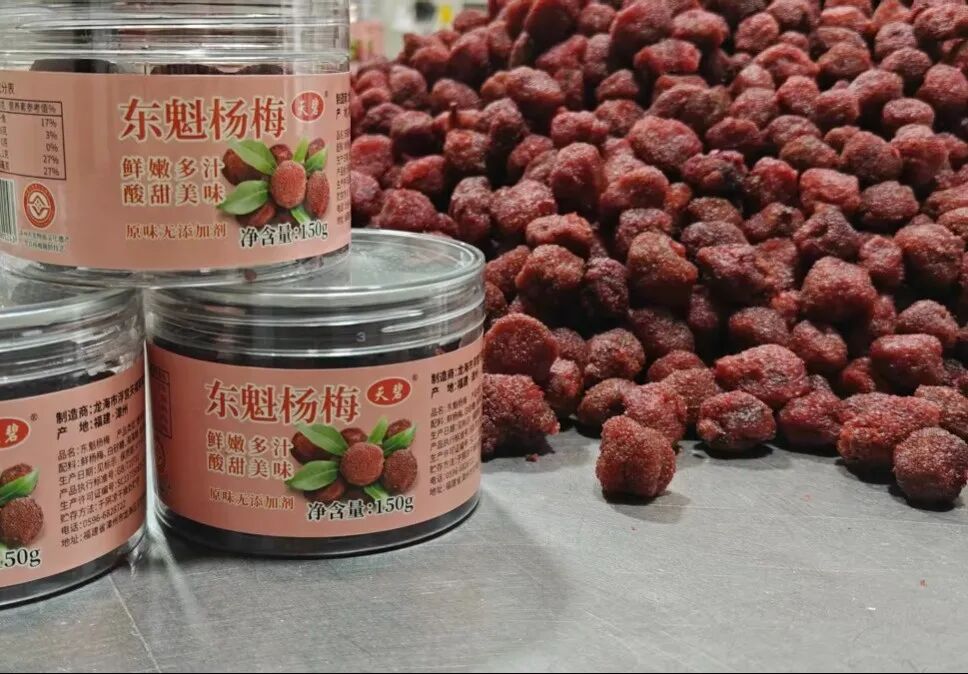 走进龙海区浮宫镇天福蜜果加工厂的生产车间,空气中弥漫着一股清甜果香。工人们正有条不紊地忙碌着,有的在清洗杨梅,有的在翻晒晾架上的半成品。工厂负责人陈碧忠穿梭其间,不时查看每一道工序的进展。“杨梅加工是个细致活,每个环节都不能马虎。”他笑着说。