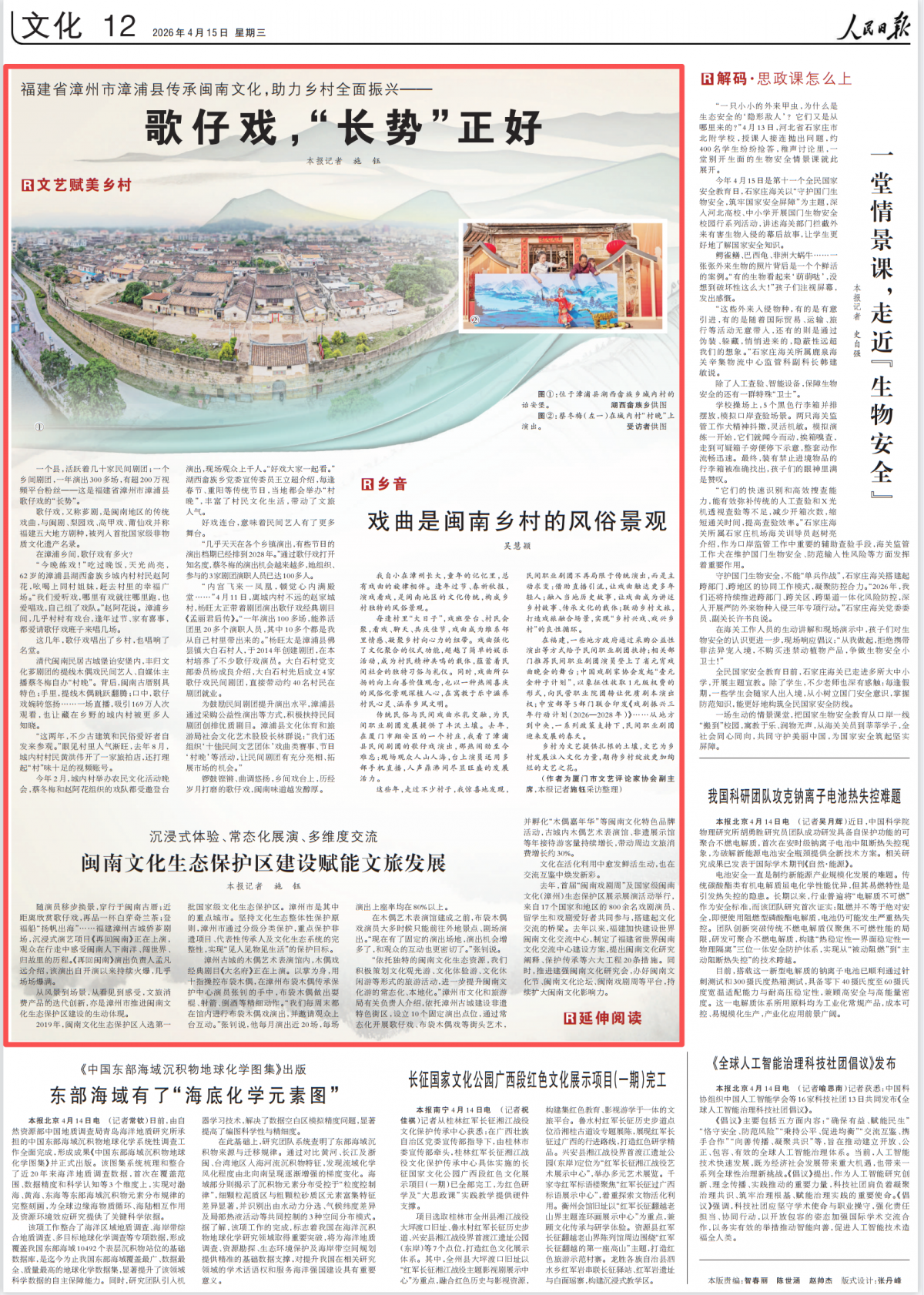 4月15日,人民日报文化版“文艺赋美乡村”栏目刊发《歌仔戏,“长势”正好》《闽南文化生态保护区建设赋能文旅发展》《戏曲是闽南乡村的风俗景观》等专题报道,聚焦闽南文化生态保护区建设成果,以福建省漳州市漳浦县歌仔戏传承发展为切入点,生动展现闽南文化,特别是闽南戏曲艺术赋能乡村全面振兴的生动实践。