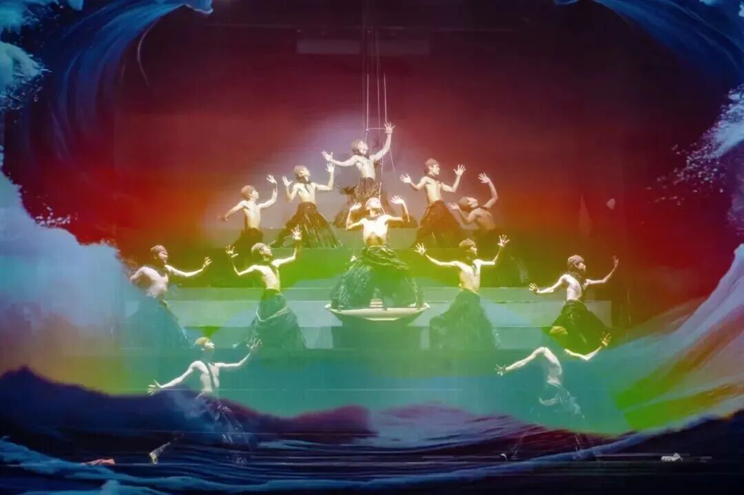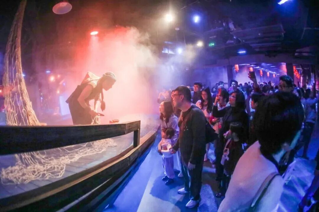 沉浸式表演把游客拉进一段历史。登上“顺泰号”的船舱,船体开始晃动,水雾扑面而来。观众跟着身旁的演员一起拉缆绳,那一刻,仿佛真的站在一艘穿越风暴、远赴南洋的船上。