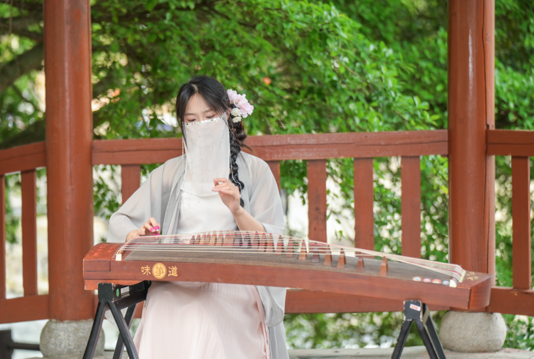 情人桥长廊赏古韵古筝,秋水阁楼下听国风乐器演奏,山水与古乐相融,氛围感拉满。