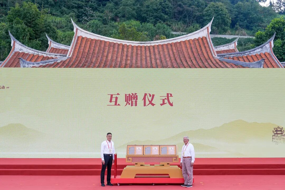 随后,极具茶乡风情的表演拉开活动序幕。嘉宾将清水岩圣泉注入池中,浇灌象征两岸同根的“枝枝朝北”树,宣告活动正式启动。信物互赠环节,台湾清水祖师文化交流协会赠予“清水同源 祖师共仰”牌匾,清水岩管委会则回赠《清水岩志》《感应》两部典籍,以礼传情,文脉相续。
