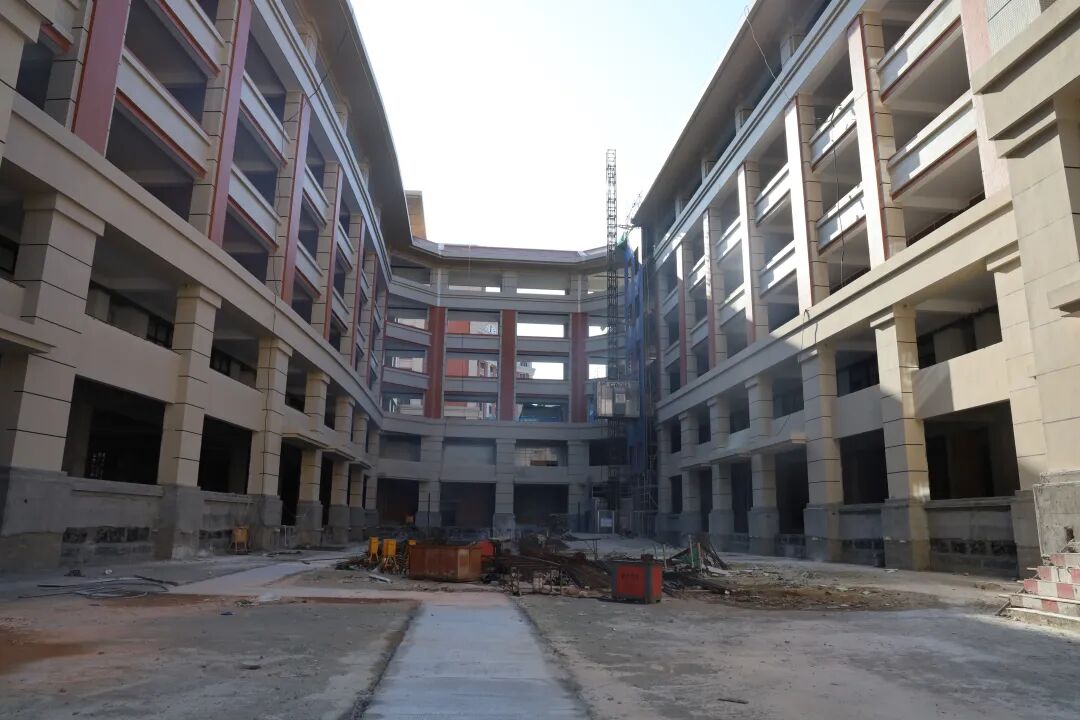 记者在项目现场看到,部分楼栋的外墙装饰与整体轮廓已基本成型。室内区域,工人们正有序进行贴砖、地面处理及清理等收尾作业。据了解,该项目严格对标省级达标标准规划建设,总建筑面积10.1万平方米,施工涵盖两大板块:进修学校重点建设综合楼及相关附属工程;清溪学校则按寄宿制初中标准打造,包含3栋教学楼、1栋综合楼、2层地下室及各类配套设施,总投资额达4.2亿元。