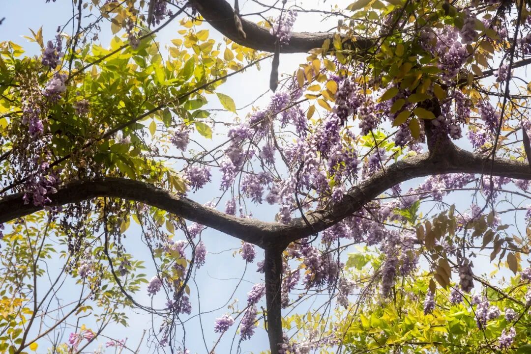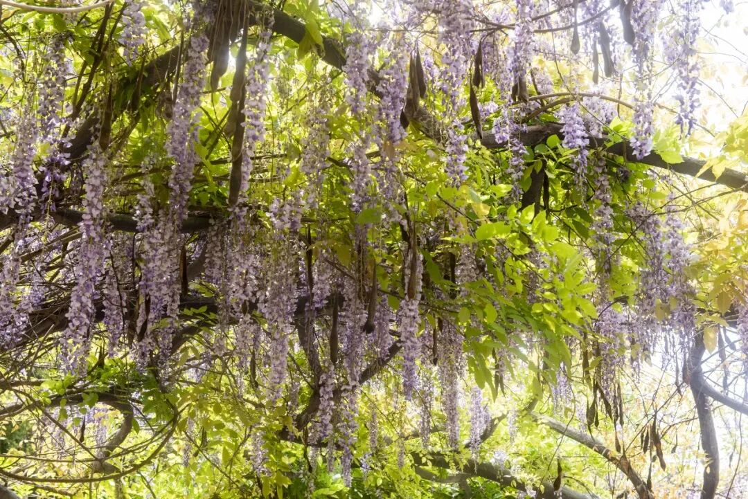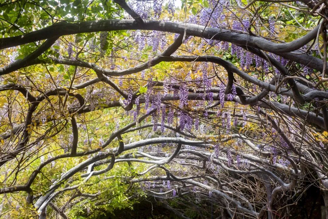 一串串淡紫色花穗垂挂于苍劲虬曲的枝蔓间