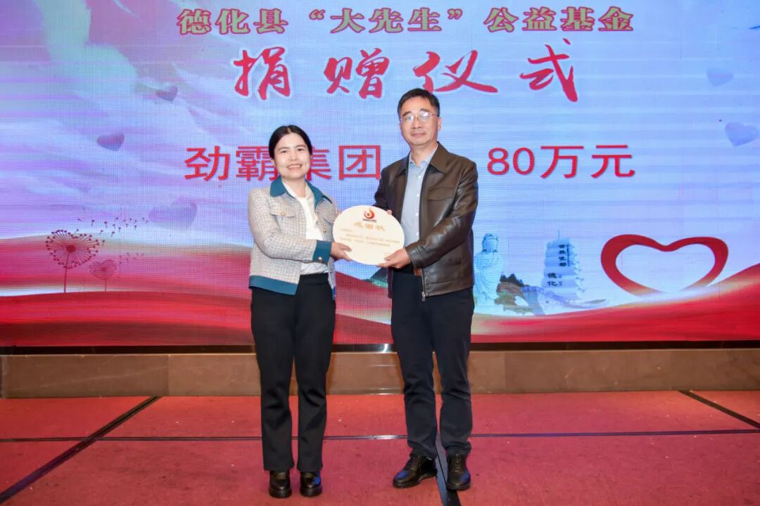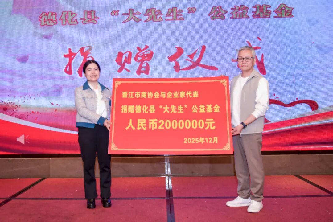 12月2日—3日,德化县招商推介暨“大先生”公益基金捐赠仪式举行,晋江市商协会与企业家代表向德化县“大先生”公益基金慷慨捐赠200万元,其中劲霸集团单笔捐赠80万元。此次善举不仅为德化县公益事业发展注入强劲动能,更以慈善为纽带深化山海协作,书写了政企同心、共促发展的动人篇章。德化县县长吴志朴、县人大常委会主任陈维启、县政协主席张秋英等县领导,晋江市委常委、统战部部长丁鸿雨,晋江市委常委、副市长吴靖宇,晋江市政协副主席、市工商联主席、总商会会长、劲霸集团董事长洪忠信等出席。