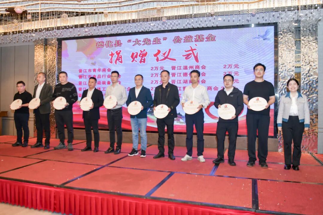 吴靖宇在致辞中表示,晋江市总商会以及各商协会积极响应、踊跃捐赠,支持德化县“大先生”公益基金,充分彰显了晋江企业家大爱大义、达济天下的情怀担当,更是为晋江与德化两地的交流合作写下了美好的注脚。晋江将以此次捐赠活动为新的起点,不断拓宽合作领域,创新合作模式,推动两地在产业发展、人才培养、文化交流、公益事业等方面结出更多硕果,让两地的情谊如同德化的白瓷,历经淬炼而更加纯粹坚固。