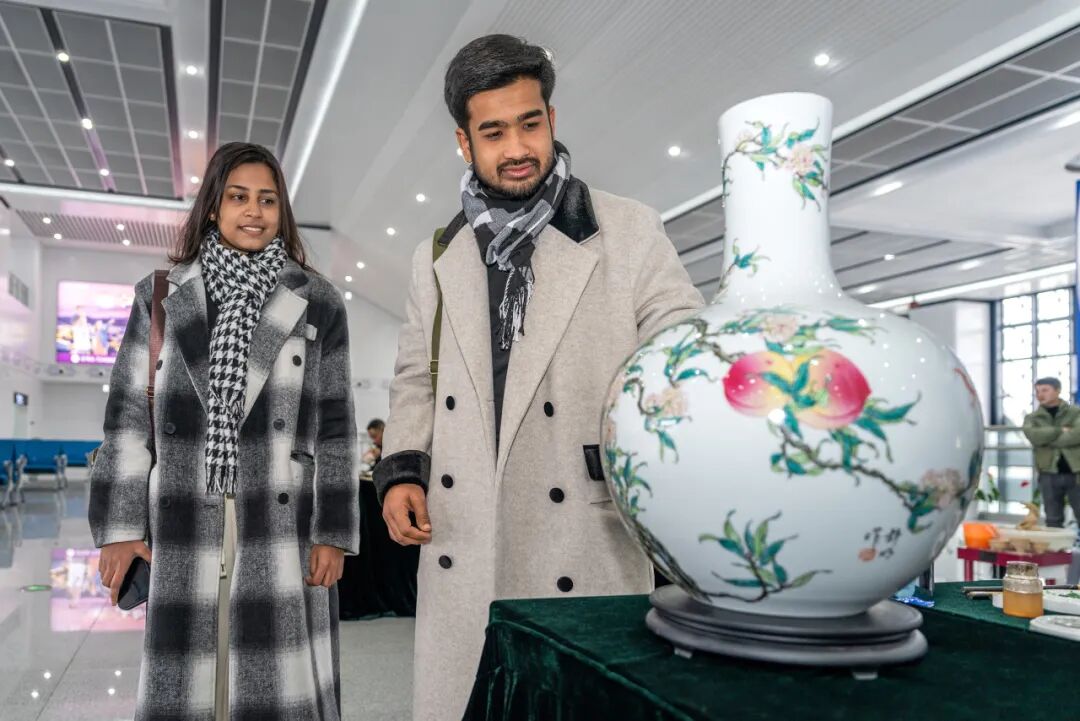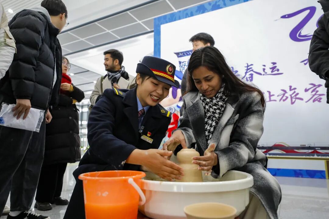 “瓷旅融合”之路,让旅途充满“瓷气”。近年来,传统文化的热度持续升温,景德镇北站与文化和旅游部合作,将景德镇制瓷非遗传承人、工匠请进车站。陶瓷文化展区内,青花瓷瓶、釉上彩瓷盘等精美工艺品整齐陈列,引得游客驻足观赏、称赞;展厅一侧的互动体验区,传承人手把手指导旅客揉泥、塑形、上釉,不少外国旅客体验后留下地址,期盼着将烧制完成的陶瓷作品寄往家乡,收藏这份独特的文化记忆。