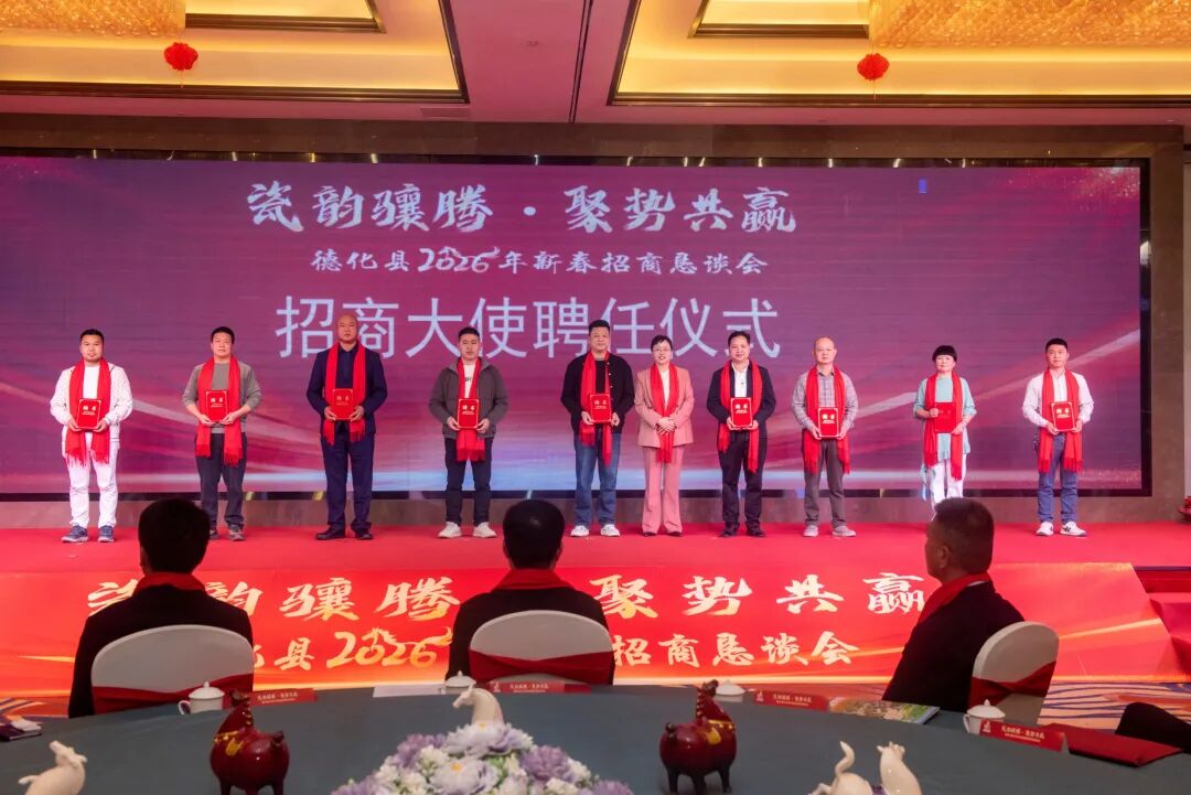 会议通报2025年德化县经济社会发展情况,并进行招商推介,现场还为2026年新聘任的31位招商大使代表颁发聘书,招商大使和商协会代表作了发言。