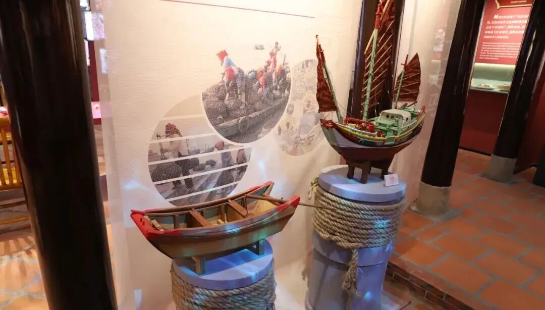 “渔歌唱晚 生生不息”生产习俗展区,完整还原蟳埔女“以海为田、向海而兴”的生产场景。展区陈列传统渔船模型、渔网、渔篓等实物,复原“讨小海”场景,搭配墙面海浪动态投影与潮汐声效,让游客直观感受蟳埔女“潮落劳作、拂晓卖鲜”的传统渔业生活。