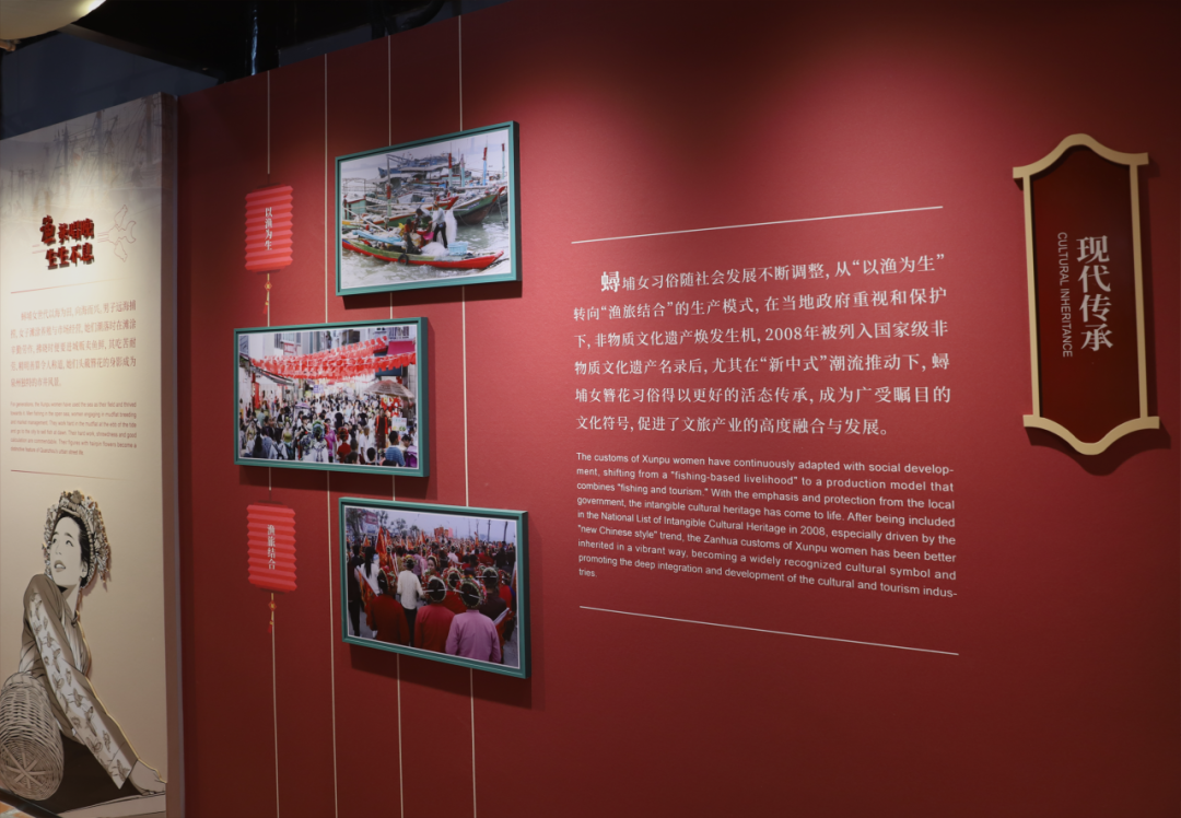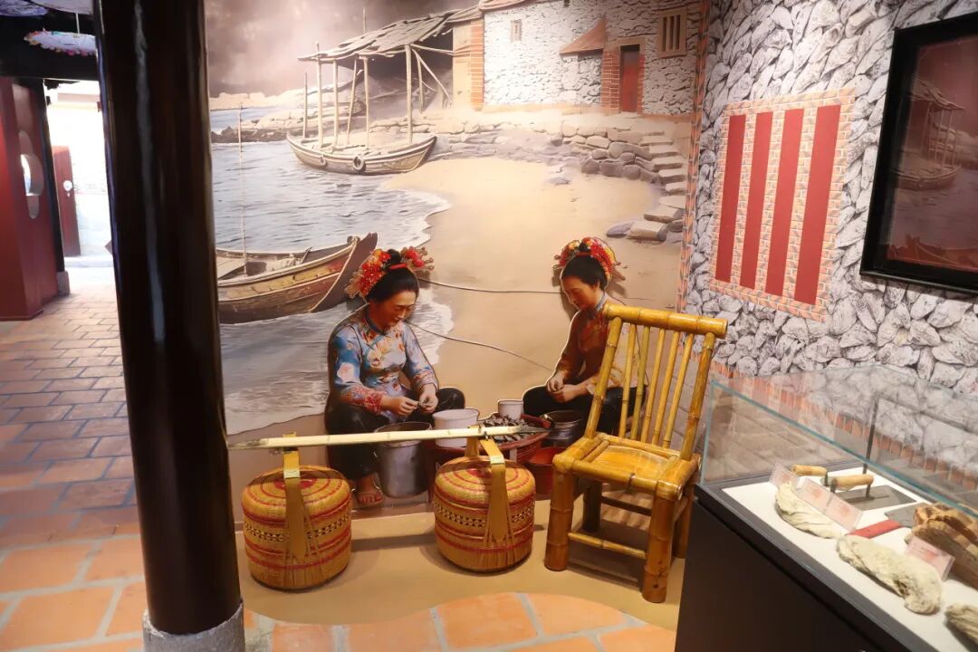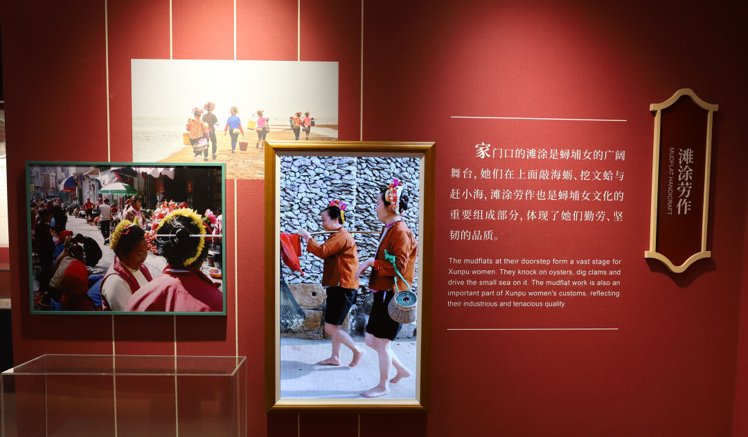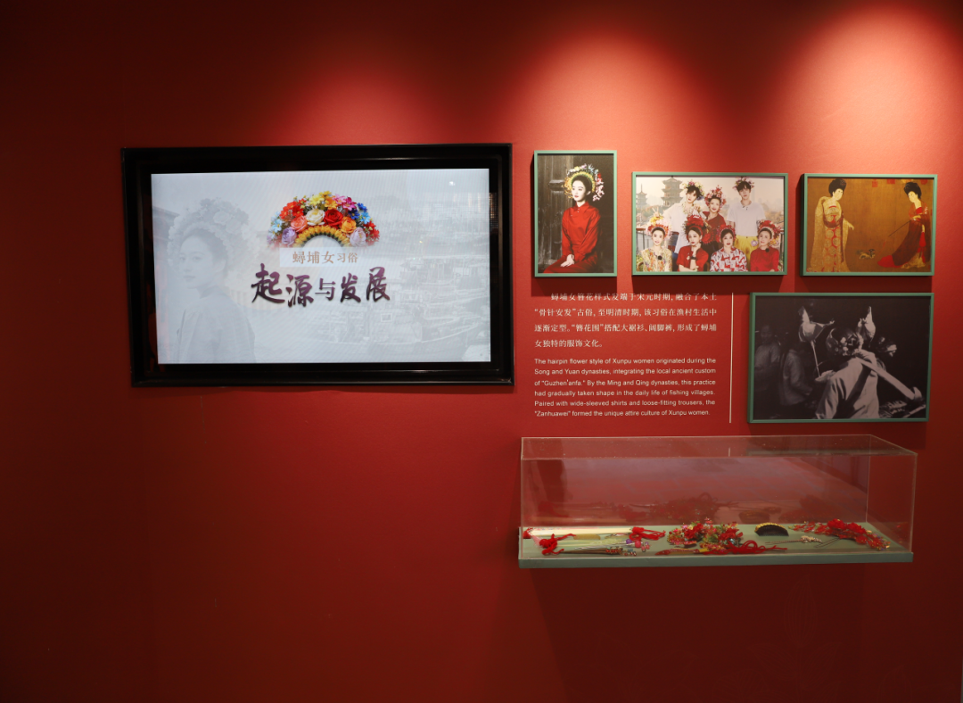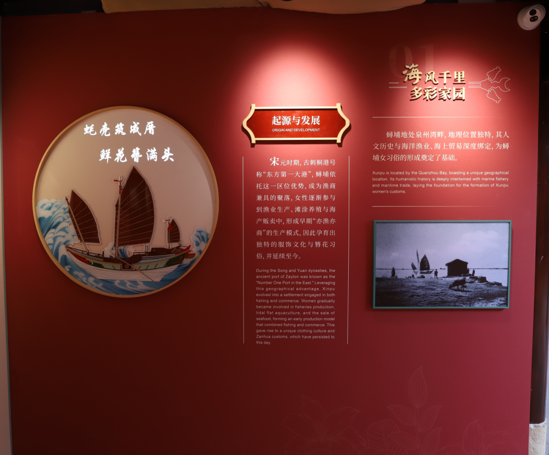 “海风千里 多彩家园”展区,聚焦蟳埔女习俗的起源与发展,展现其与海洋渔业、海上贸易的深度绑定。展区通过图文、实物结合的方式,呈现宋元时期蟳埔“渔商兼具”的聚落特征——女性逐渐参与渔业生产、滩涂养殖与海产贩卖,孕育出独特的服饰文化与簪花习俗。