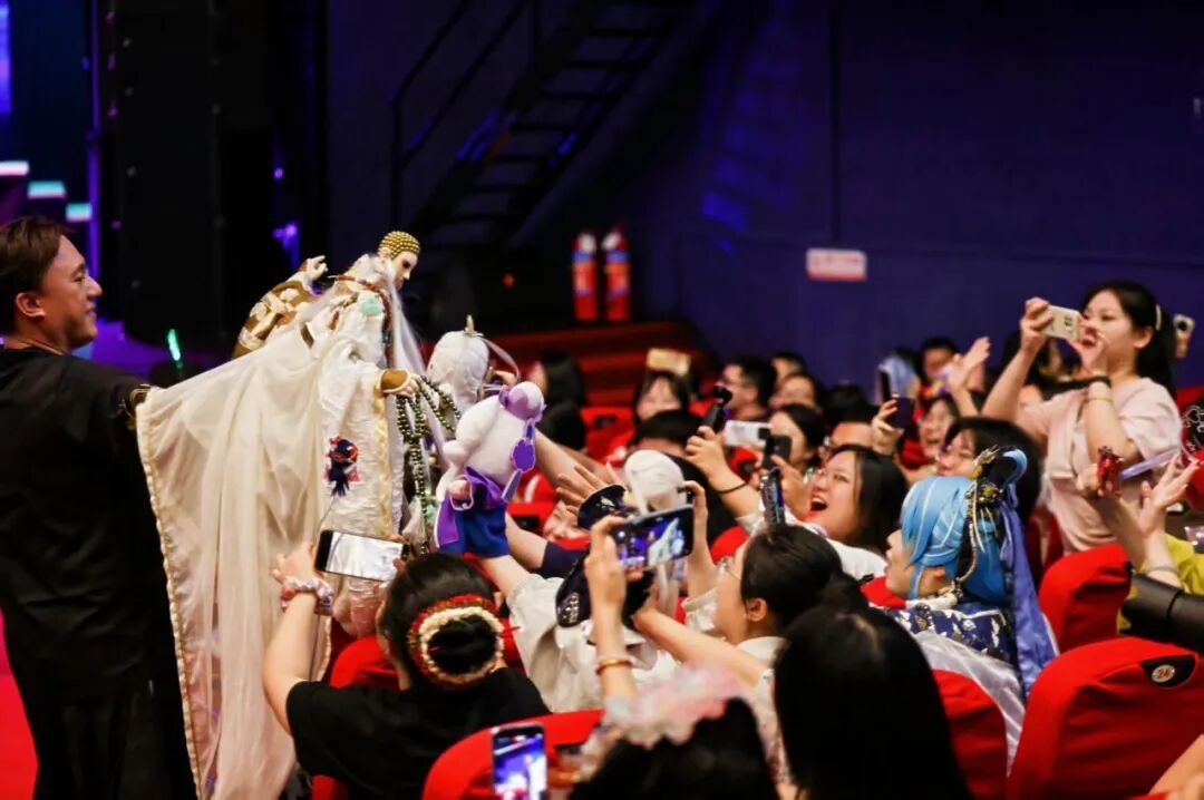 演出落幕后,影剧院外广场依旧热情涌动。霹雳操偶师现场教学木偶操控技巧,Coser与观众亲切合影,文创集市上两岸粉丝互换手作周边,畅谈戏偶艺术。