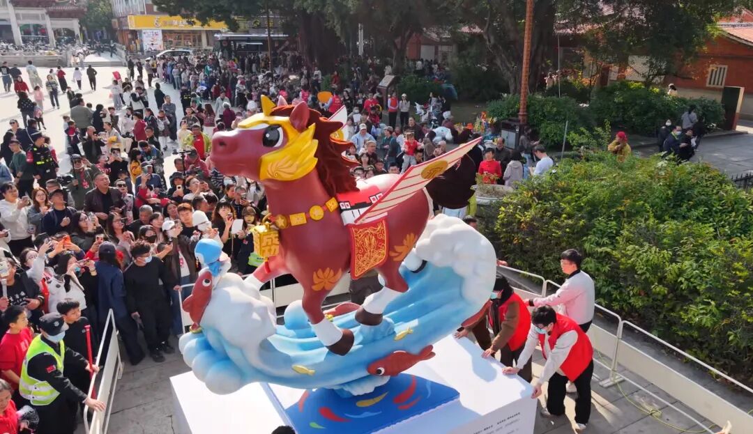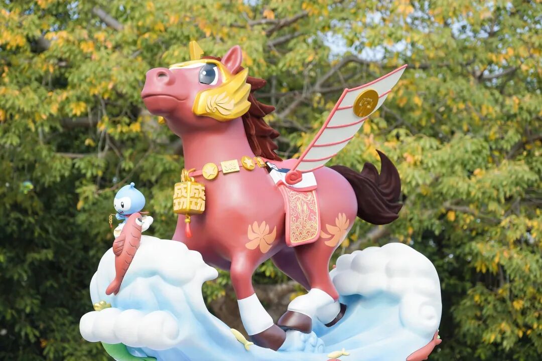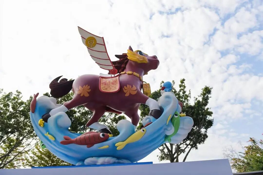 身躯用泉州市花刺桐花点缀,如火焰般炽热绽放,彰显出团结一心、共赴前程的热血信念;船帆状的“翅膀”上下摆动,四蹄踏浪而行,既呼应泉州作为海丝起点的福船智慧,也以“帆随浪起”寓意跨越海峡的拼搏精神。