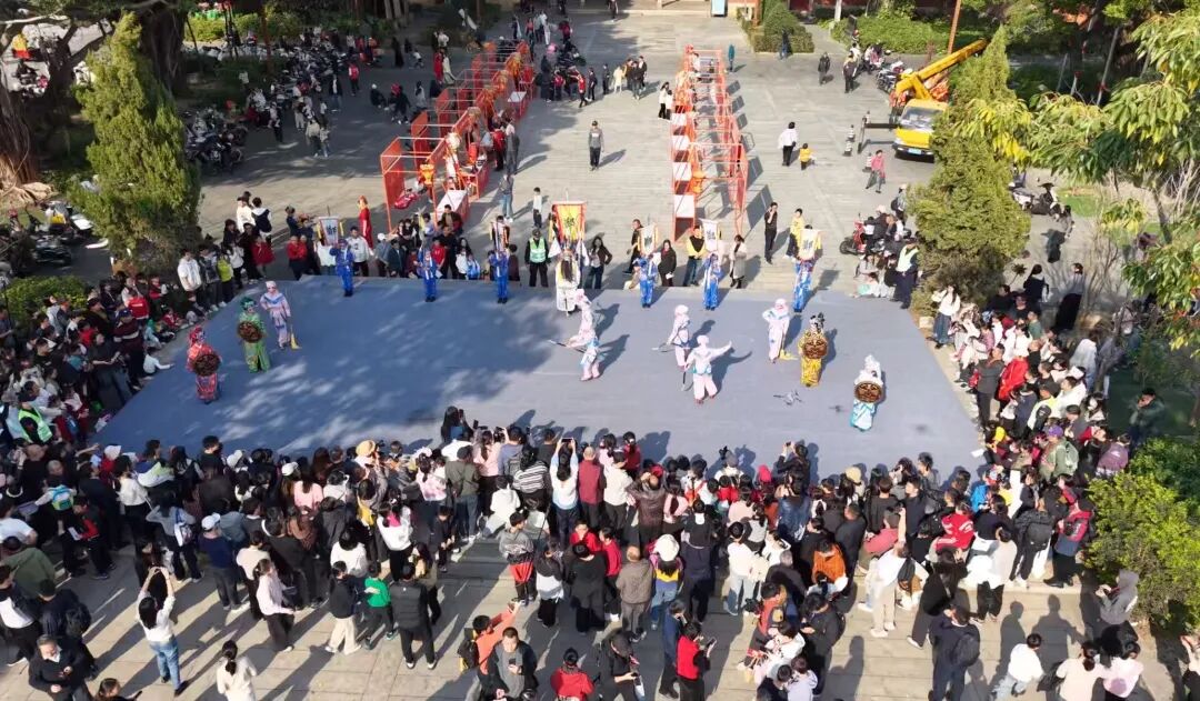 现场,“南安郑成功小高甲戏”热烈上演,以传统戏曲演绎英雄史诗,吸引众多市民游客驻足,现场还免费发放周边限定贴纸。