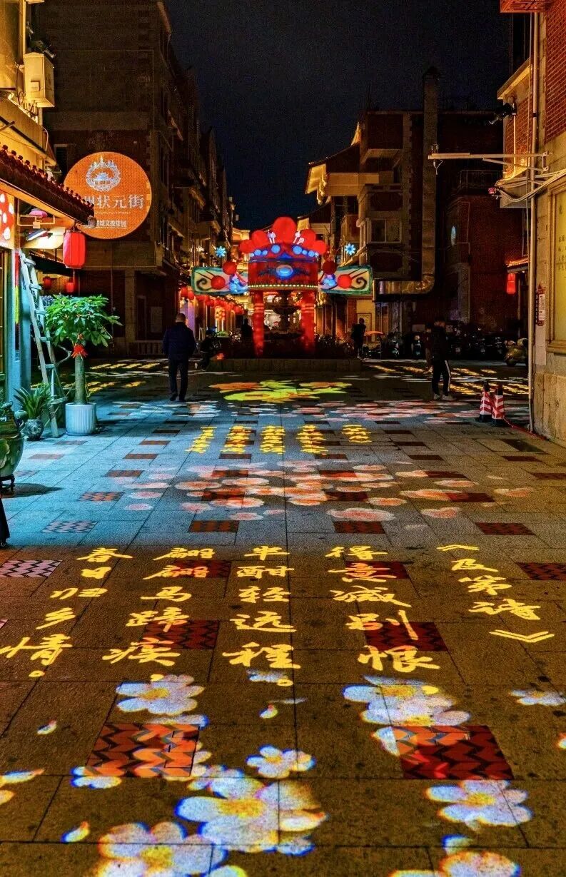 状元街暖黄灯光勾勒燕尾脊,光影里浮现出一行行诗词字影,与古街文脉静静对话。