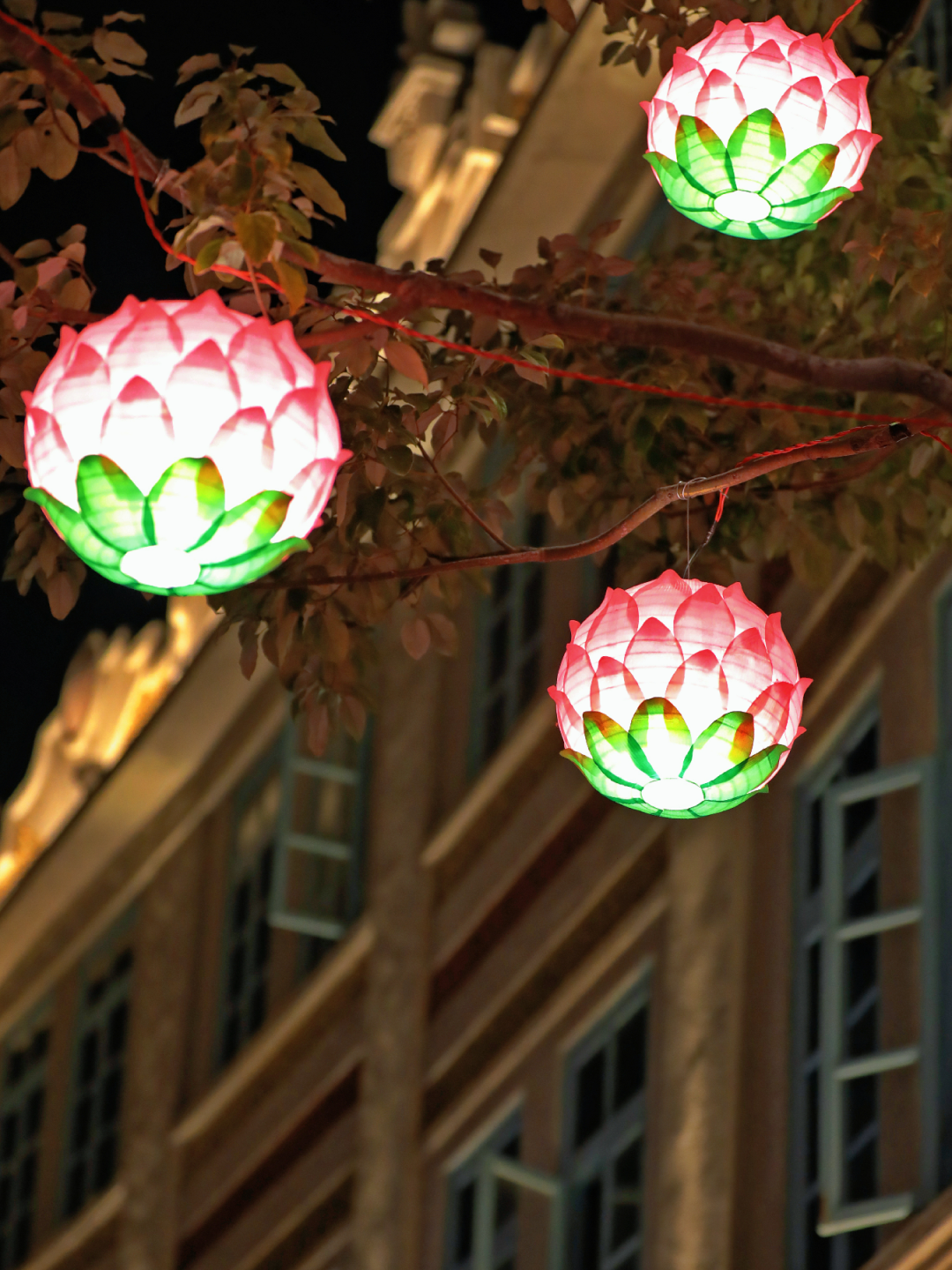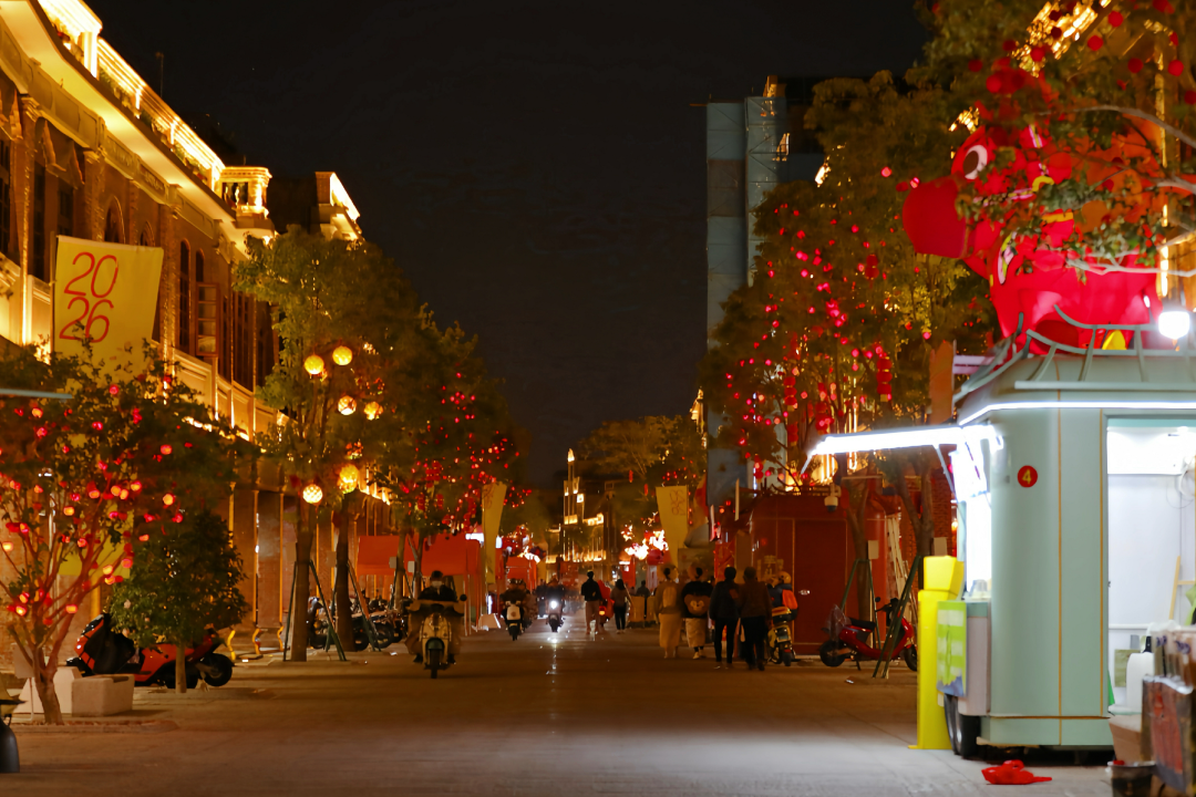 通政巷里,30余朵火红刺桐花灯红光透亮,在古厝山墙映出暖色剪影,与滴水兽艺术装置相映成趣。