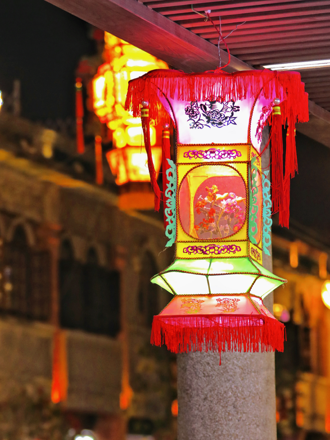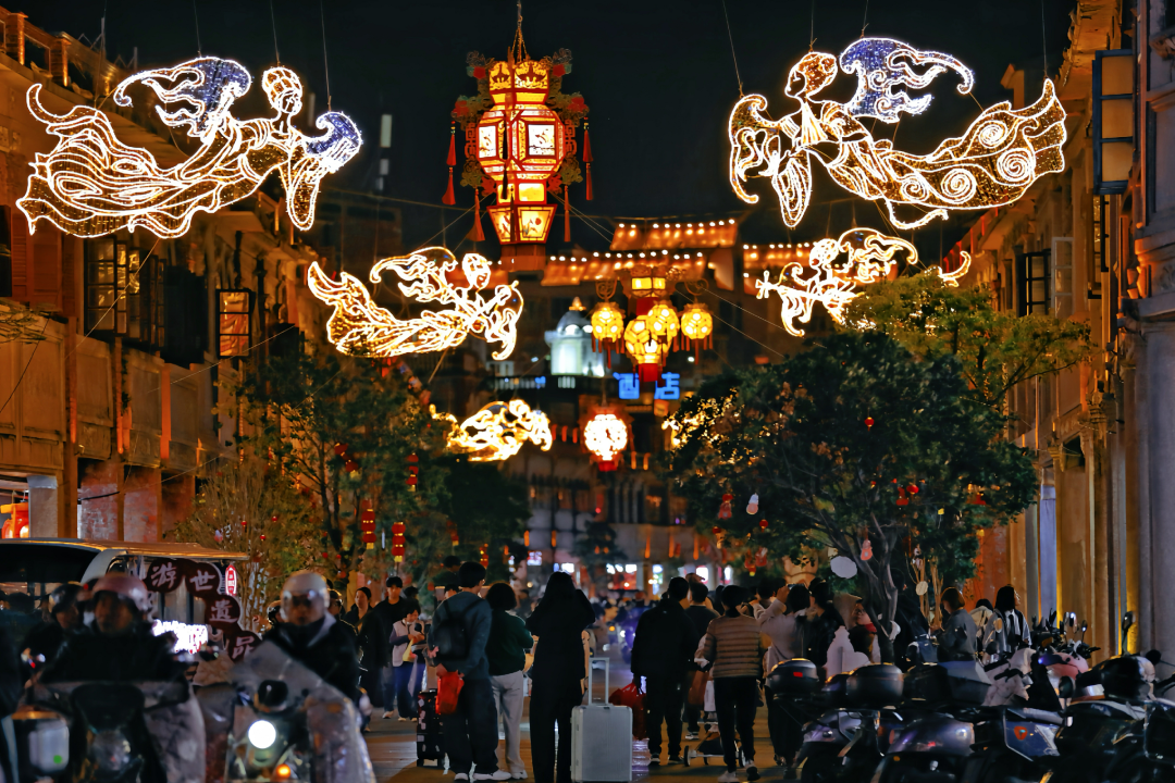 中山中路上方,三组“妙音飞天”花灯点亮长街,刻纸花灯工艺精湛,飞天乐伎衣带飘飘,骑楼两侧数百盏传统花灯令人流连。