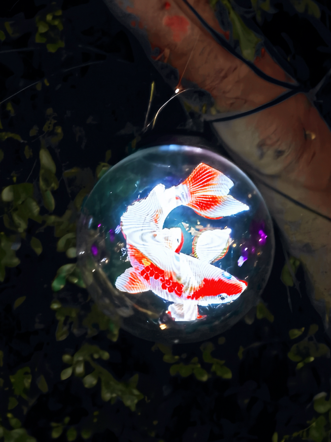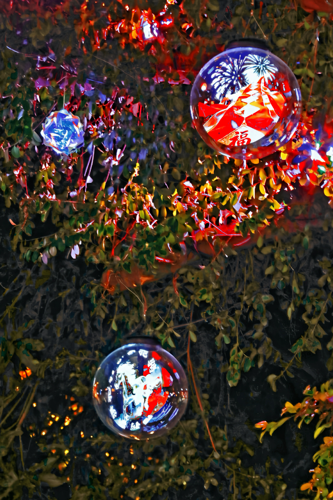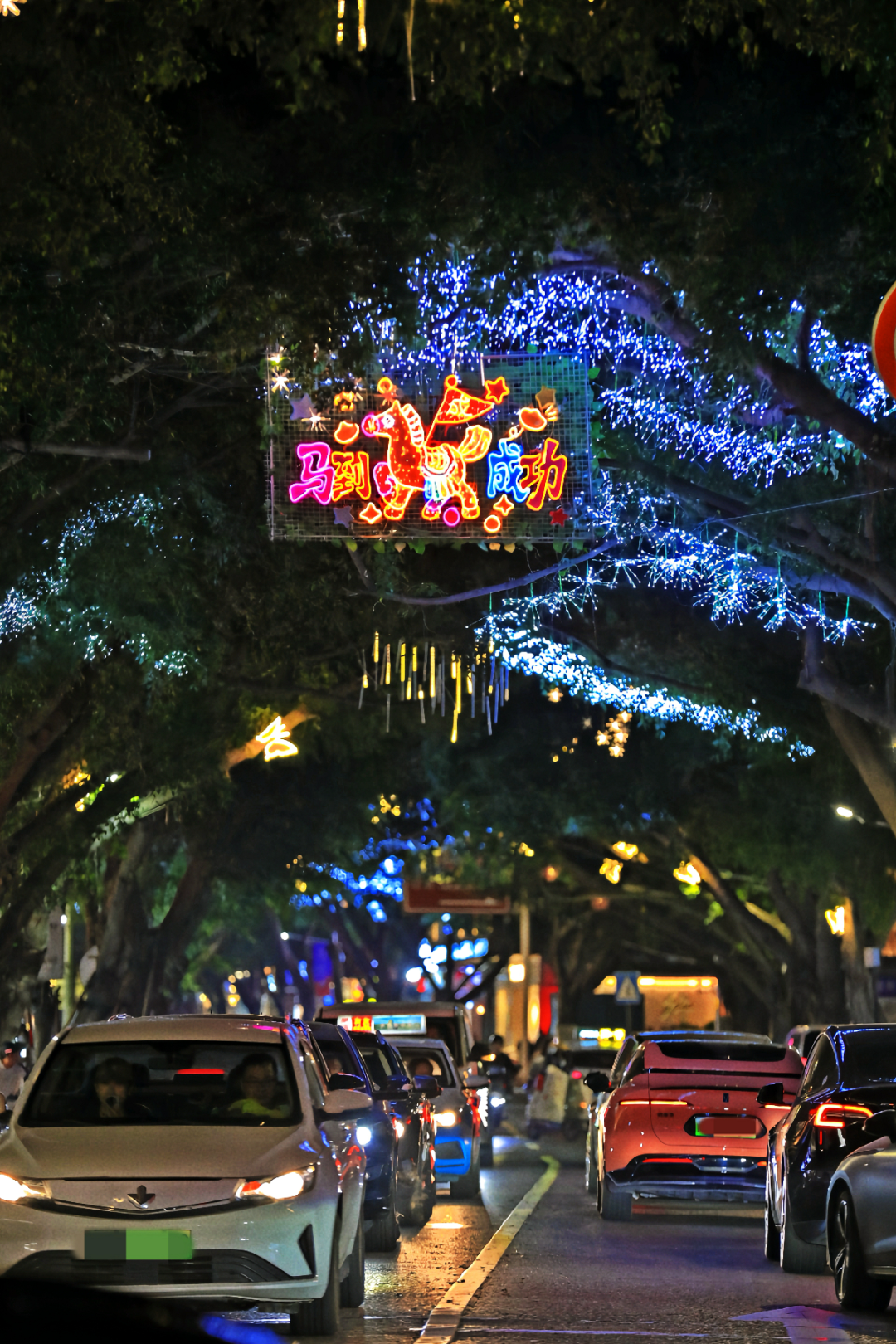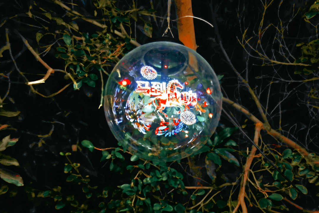庄府巷科技感十足的树木亮化装置,更是令人眼前一亮。绿意盎然的树冠间,数十个透明球形的动态全息屏如气泡般悬浮枝头;光影流转间,烟花绽放,一匹匹红色骏马在屏内奔腾,线条灵动,充满张力。部分球形屏穿插显示着“新年快乐”“2026”等彩色艺术字,与生肖画面相映成趣。这套以全息球形屏为核心的灯饰,入夜化作悬浮的幻彩光球,为古城街巷增添喜悦的律动。