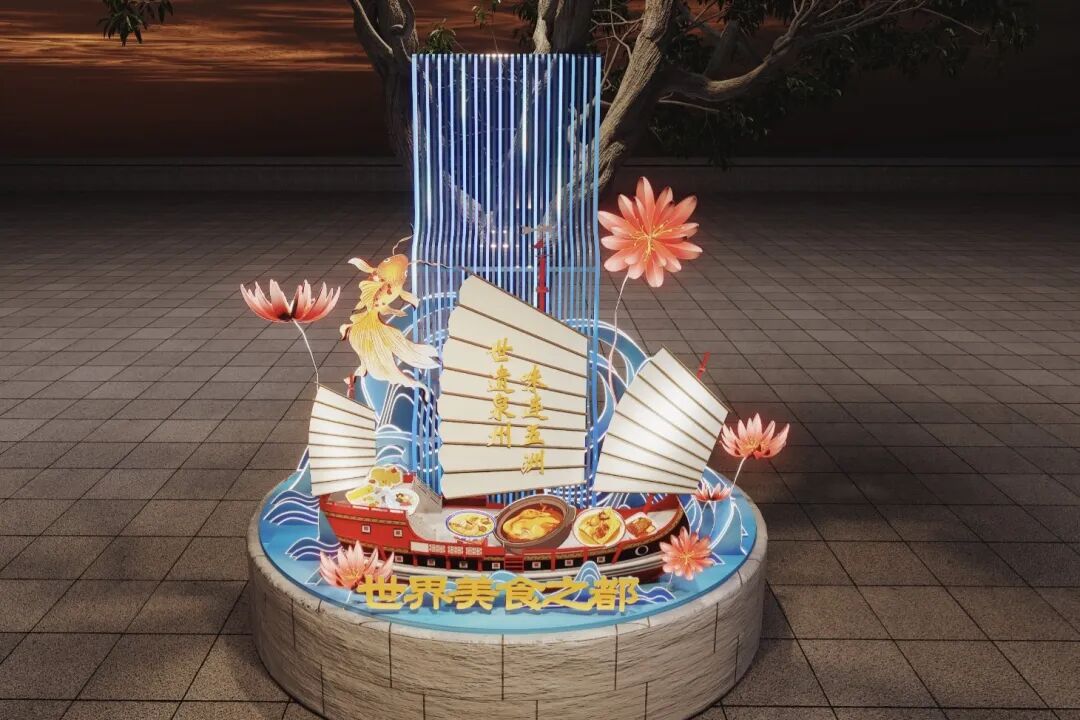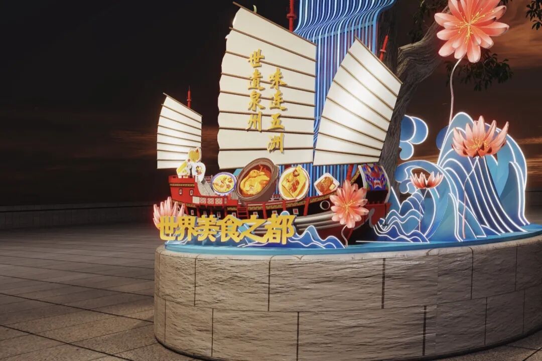 威远楼前,一艘以“世遗泉州·世界美食之都”为主题的福船造型装置蓄势待发,计划于春节前正式亮灯。装置核心是一艘仿古福船,三面白帆舒展如翼,帆面上“世遗泉州,味连五洲”八个鎏金大字熠熠生辉。船舷之上,姜母鸭、肉粽、面线糊等一道道闽南珍馐化为玲珑灯彩,以光作墨,以影为笺,写就一封来自“世界美食之都”泉州的请柬。
