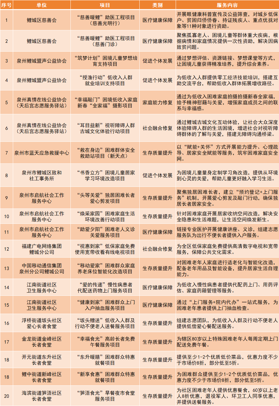 据介绍,20个服务站点集聚了区慈善会、泉州真情在线公益协会、致和社工事务所以及各街道社区卫生服务中心、多家社区长者食堂等各方力量,承接运营“慈善暖鲤”“筑梦计划”“授渔行动”“幸福敲门”等20个特色服务项目,覆盖医疗健康、促进发展、家庭支持、社会融合等多个领域。