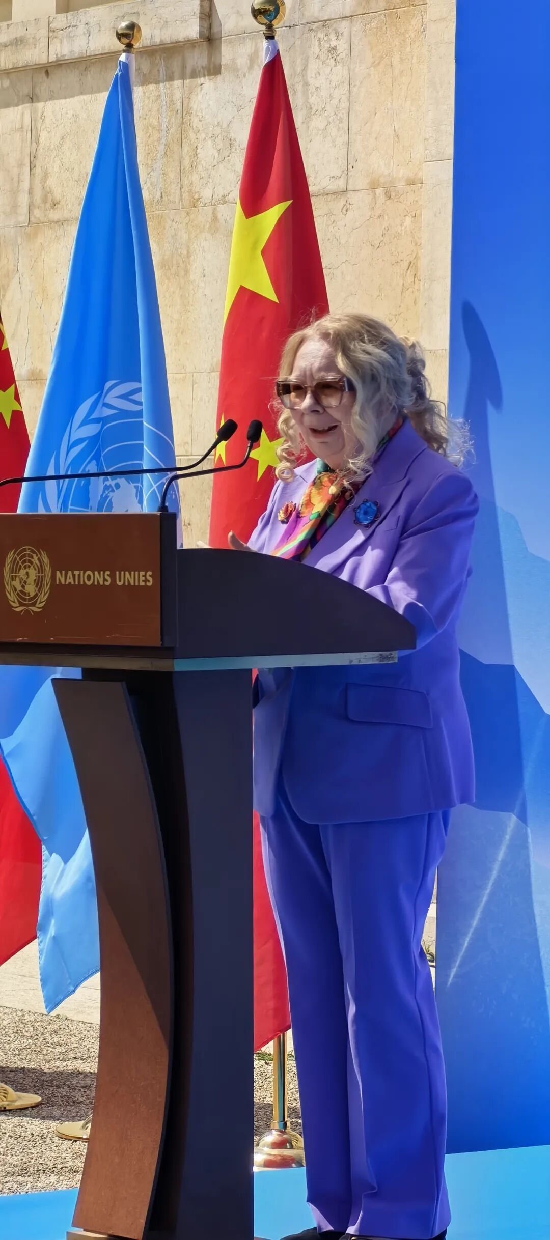联合国日内瓦办事处总干事瓦罗瓦娅女士现场致辞,胸前佩戴着刺桐花造型的金苍绣胸针