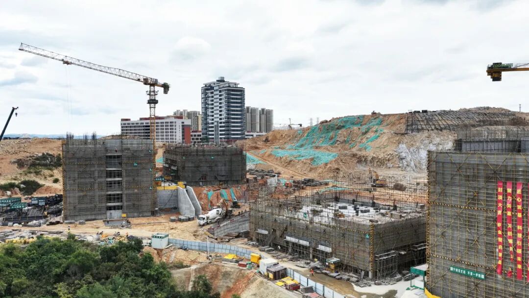 在洛江岁金·未来科技城产业园项目建设现场,已封顶的楼栋初具规模,脚手架和安全网包裹的楼体上,“封顶大吉”的红色条幅格外醒目。而其他区域,塔吊林立,机器轰鸣,上百名建筑工人分布在各个作业面上,正在紧张有序地作业,现场一派热火朝天的建设景象。