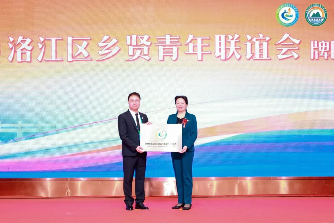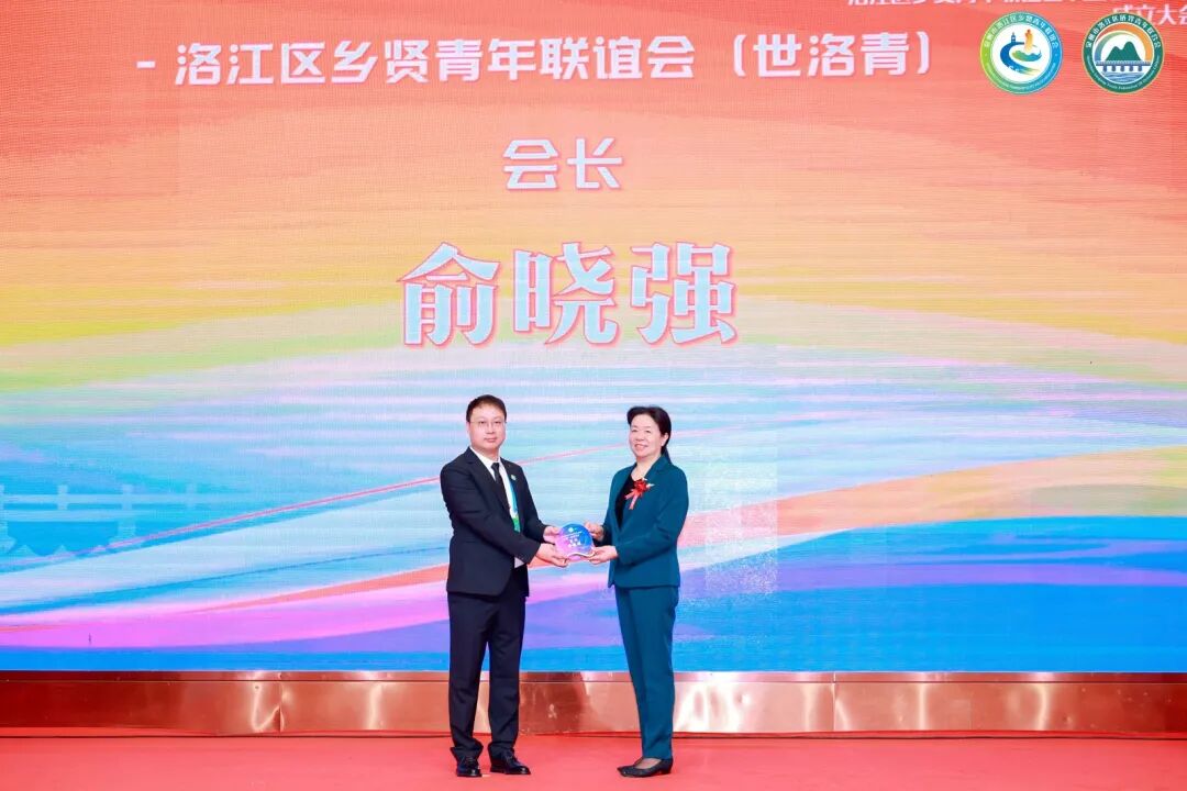 颜丽明为俞晓强颁授洛江区乡贤青年联谊会牌匾及会长任职证书。