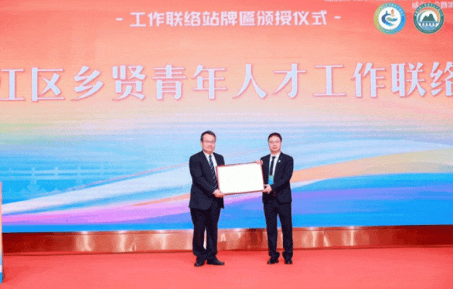 王志宏向俞晓强、吴凌锋颁授洛江区乡贤青年人才工作联络站、洛江区侨界青年人才工作联络站牌匾。