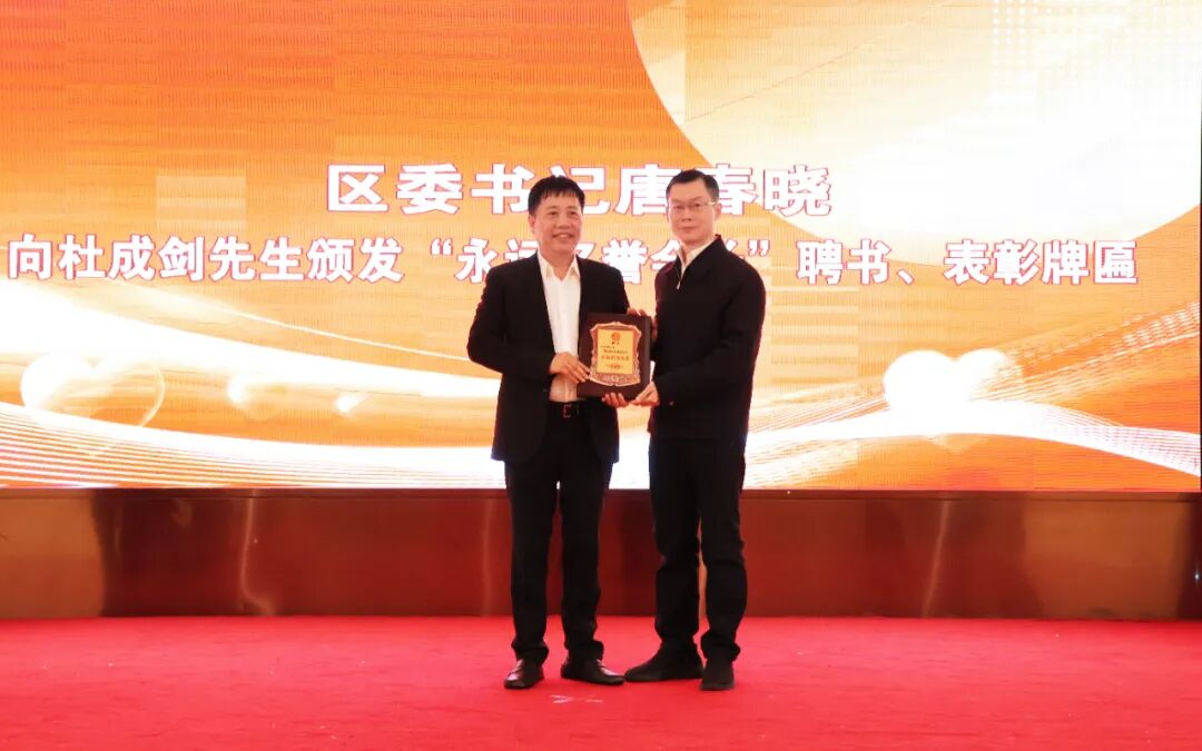 仪式上,唐春晓向长沙市泉州商会会长杜成剑颁发洛江区慈善总会“永远名誉会长”聘书及表彰牌匾;杜成剑代表商会向郭宁举牌捐赠。