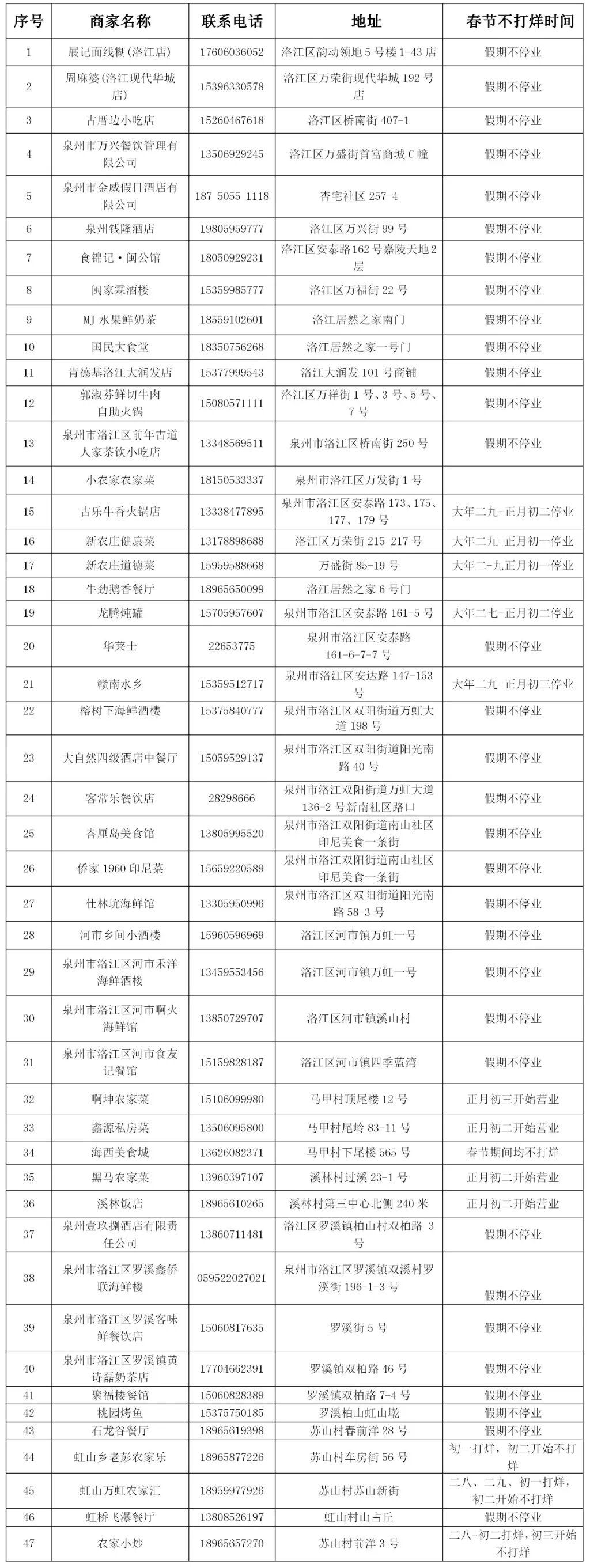 今年洛江共有47家餐饮商家全程在岗营业,涵盖酒楼、闽南菜、连锁餐饮、特色小吃,从早到晚满足你的舌尖需求。