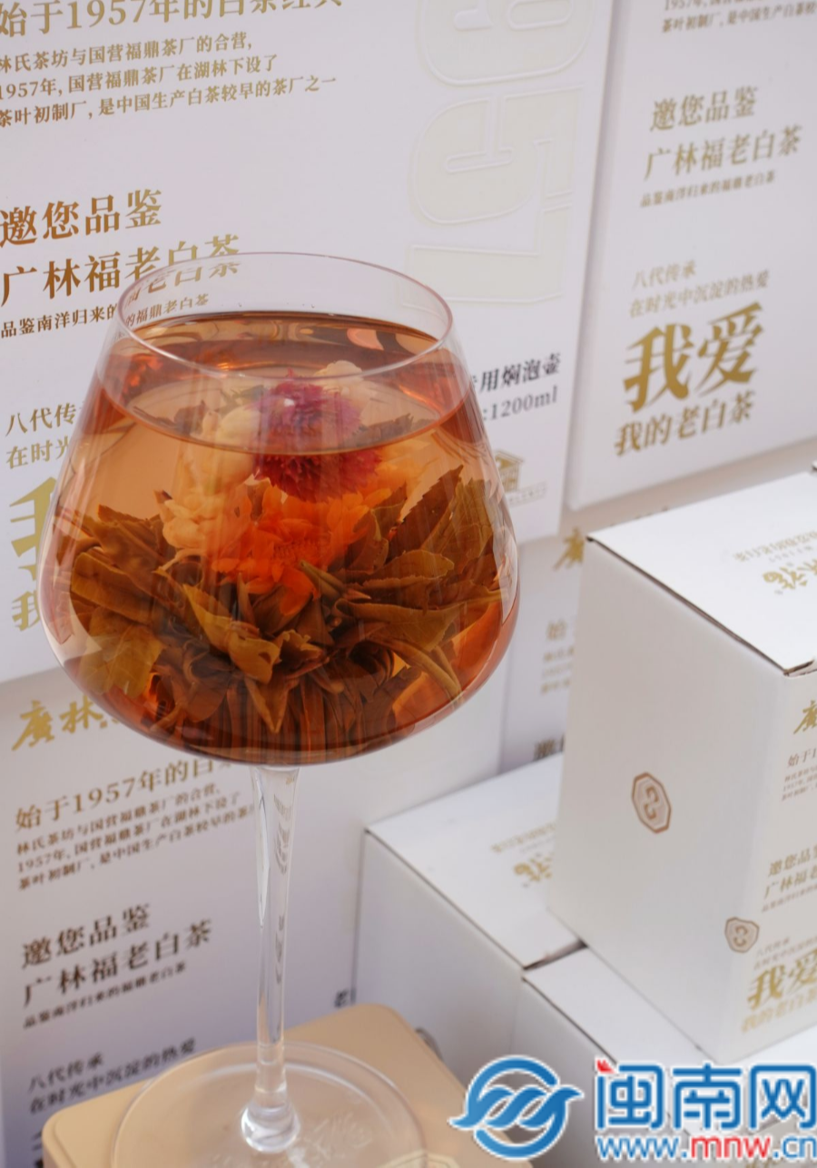 广林福福鼎白茶泉州地区负责人翁小姐向记者展示了一款出口欧洲的工艺花茶 “双龙戏珠”,以白茶为基底,金盏花居中绽放,两侧茉莉花点缀,顶端缀着一朵千日红,造型精美别致。“恰逢假期吸引了很多市民游客来参与,我们正在洽谈不少团体订单,希望多办这类活动,让更多人了解茶文化。” 翁小姐说。