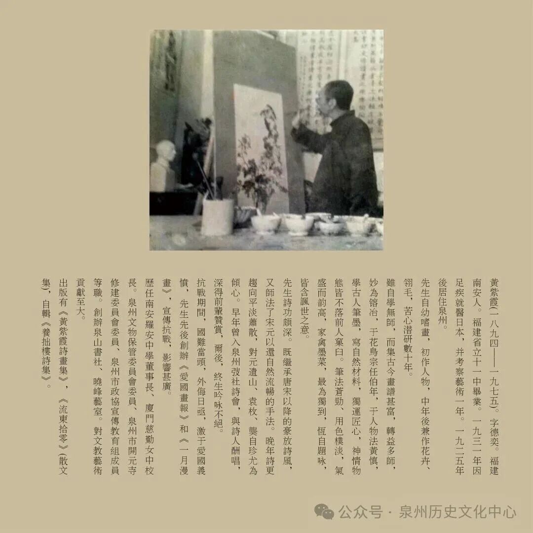黄紫霞,字德奕,泉州南安罗东人。居住泉州中山中路。能诗,擅书。设“晓峰画室”,创办“泉山书社”。抗战期间,先后创办《爱国画报》和《一月漫画》,宣传抗战,影响甚广。抗战胜利后,兼任厦门罐头厂、枫角汽车公司及泉德汽车公司董事。历任南安罗安中学董事长、厦门慈勤女中校长,泉州文物保管委员会委员、泉州市开元寺修建委员会委员、泉州市政协宣传教育组成员等职。著有《流东拾零》(散文集),自辑《养拙楼诗集》。