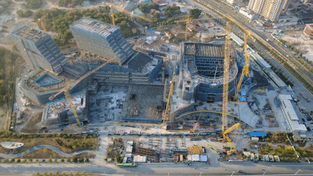 走进项目施工现场,机械轰鸣、塔吊林立、施工车辆往来穿梭,数百名施工人员分布在各个区域有序作业,现场一片繁忙景象。目前,该项目酒店区域、商业街区和演艺剧场区域正同步进行主体结构施工,预计春节前完成项目主体结构全面封顶。