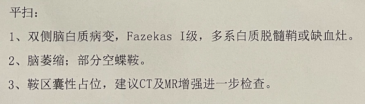 眼底病科孟冠军医生详细了解病情后,安排了全面视野检查,发现其双眼视野均存在异常。结合丰富的临床经验,孟冠军医生怀疑病因在颅内,立即建议进行头颅核磁共振检查。泉州爱尔眼科医院随即开通与泉州医高专附属人民医院的绿色通道,次日便为孙阿姨完成检查,然而检查结果让大家心头一紧,孙阿姨的颅内鞍区确实有一个囊性占位。